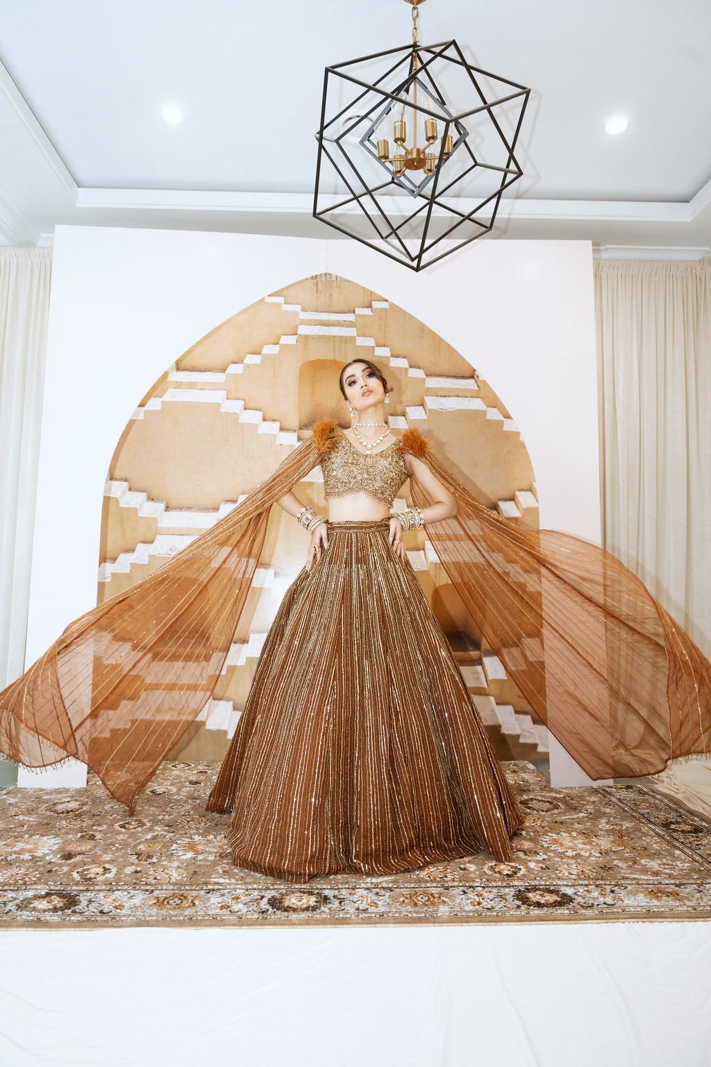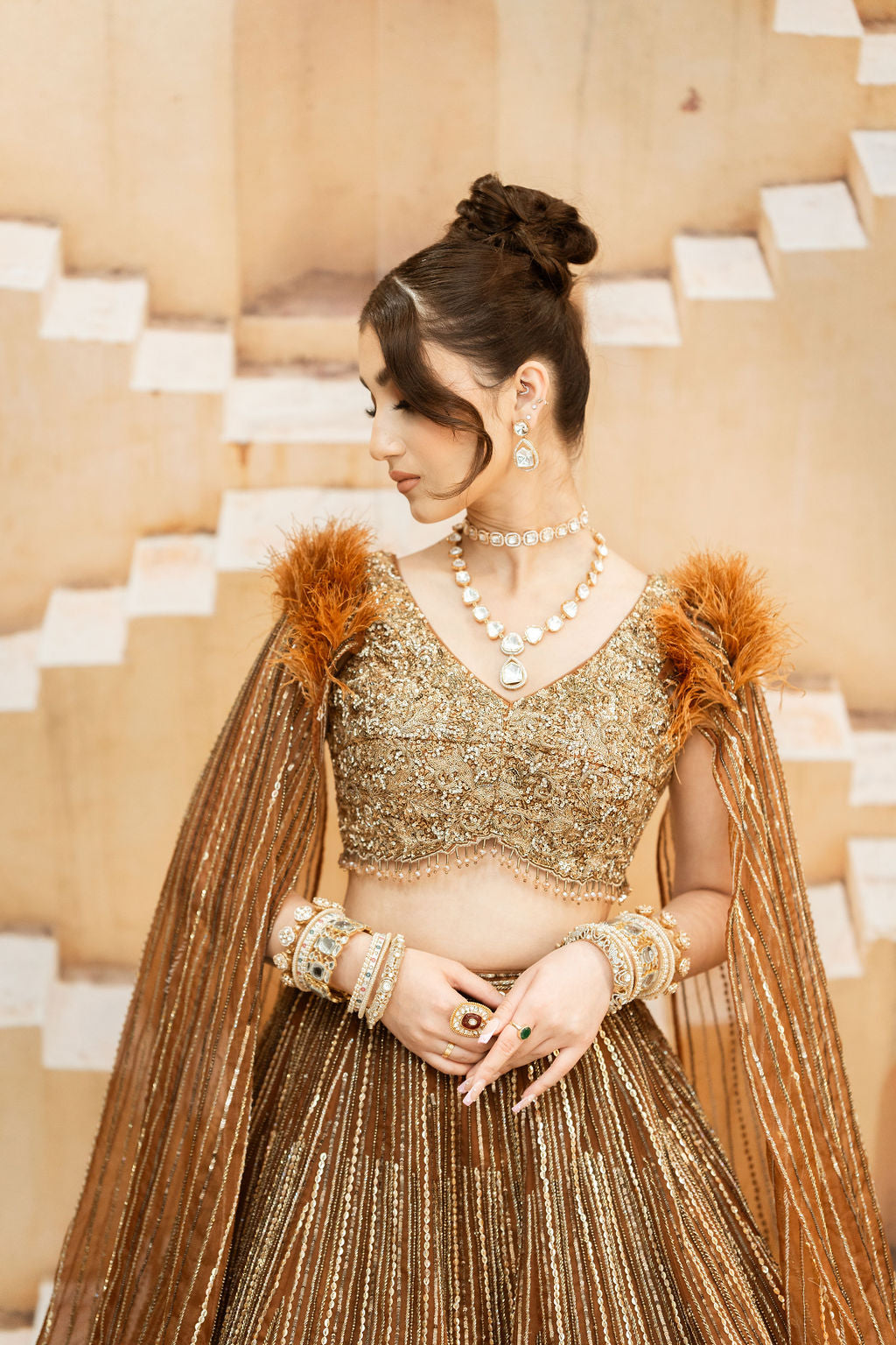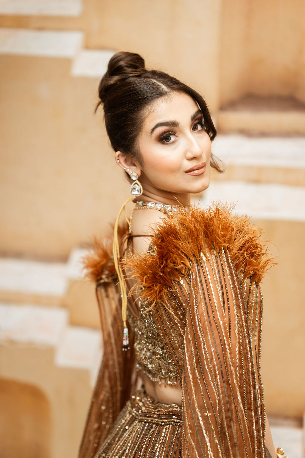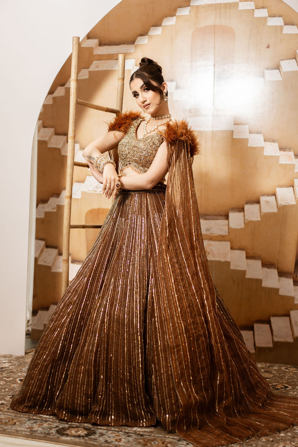 Introducing our exquisite Coppery Brown Reception Lehenga, a fusion of elegance and modernity designed to make you shine on your special day.