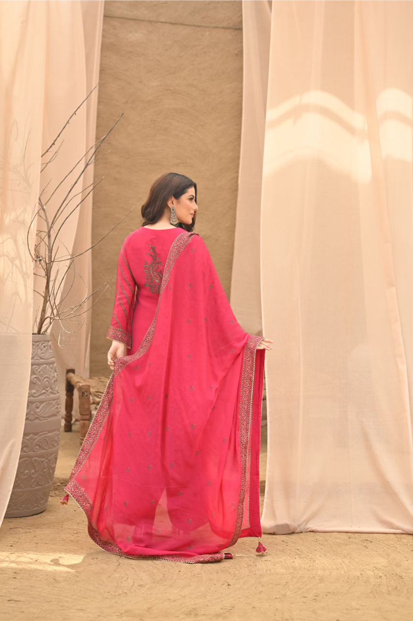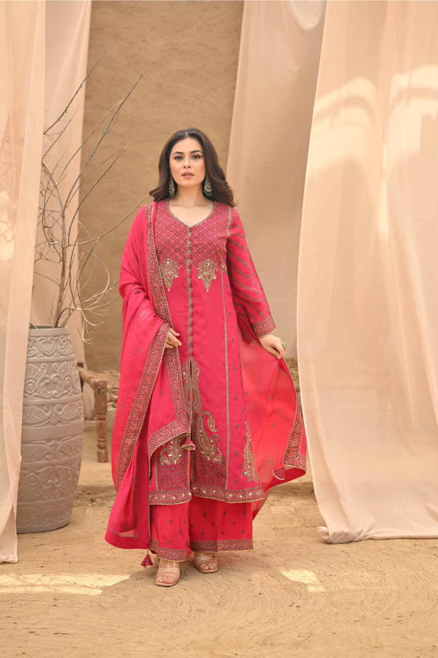 Enchanting pink suit, beautifully adorned with delicate gold embroidery that radiates sophistication. Crafted from premium fabric, it seamlessly combines tradition with modern style, making it perfect for any special occasion. Embrace the refined charm and comfort of this exquisite ensemble, tailored to enhance your grace and poise.
