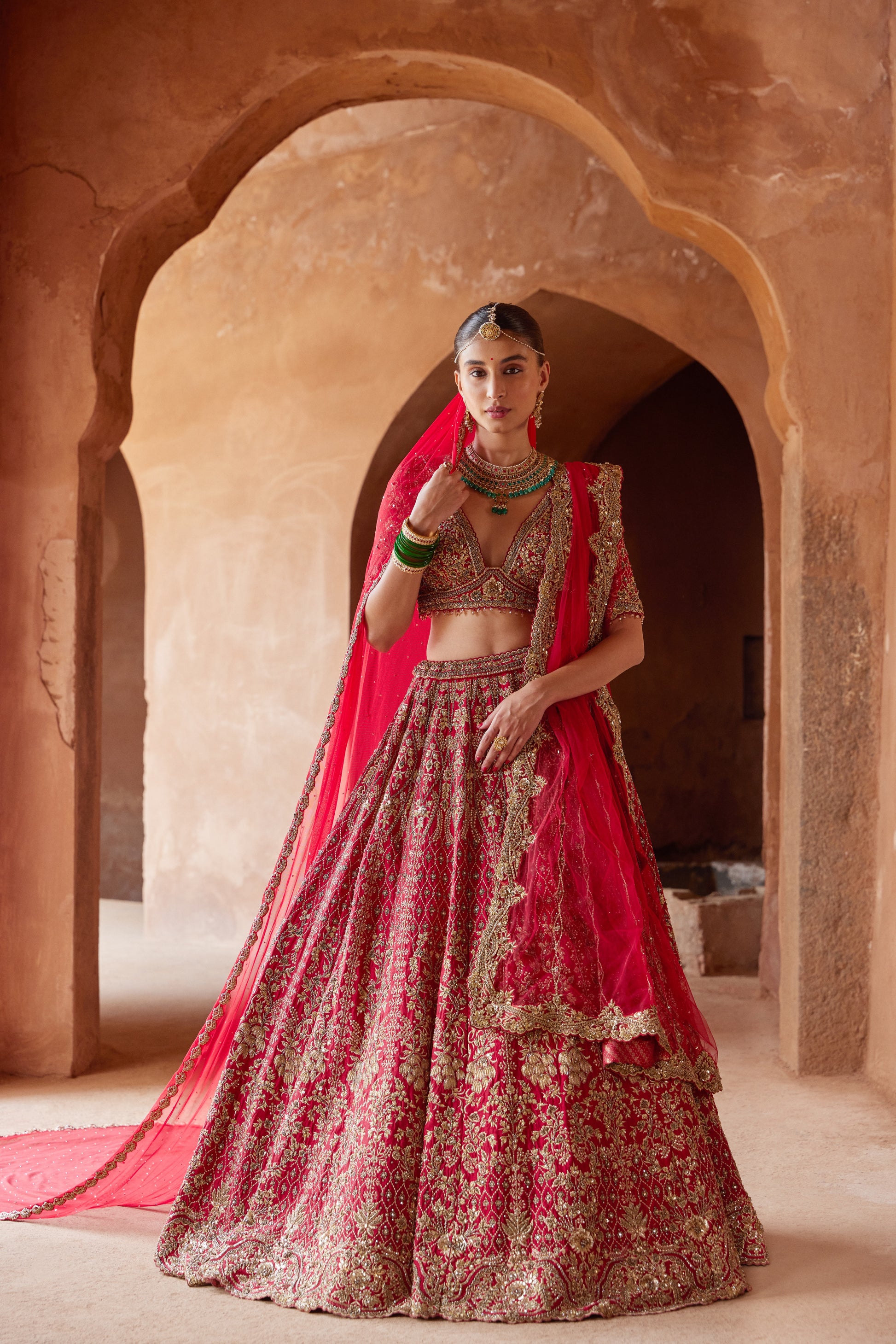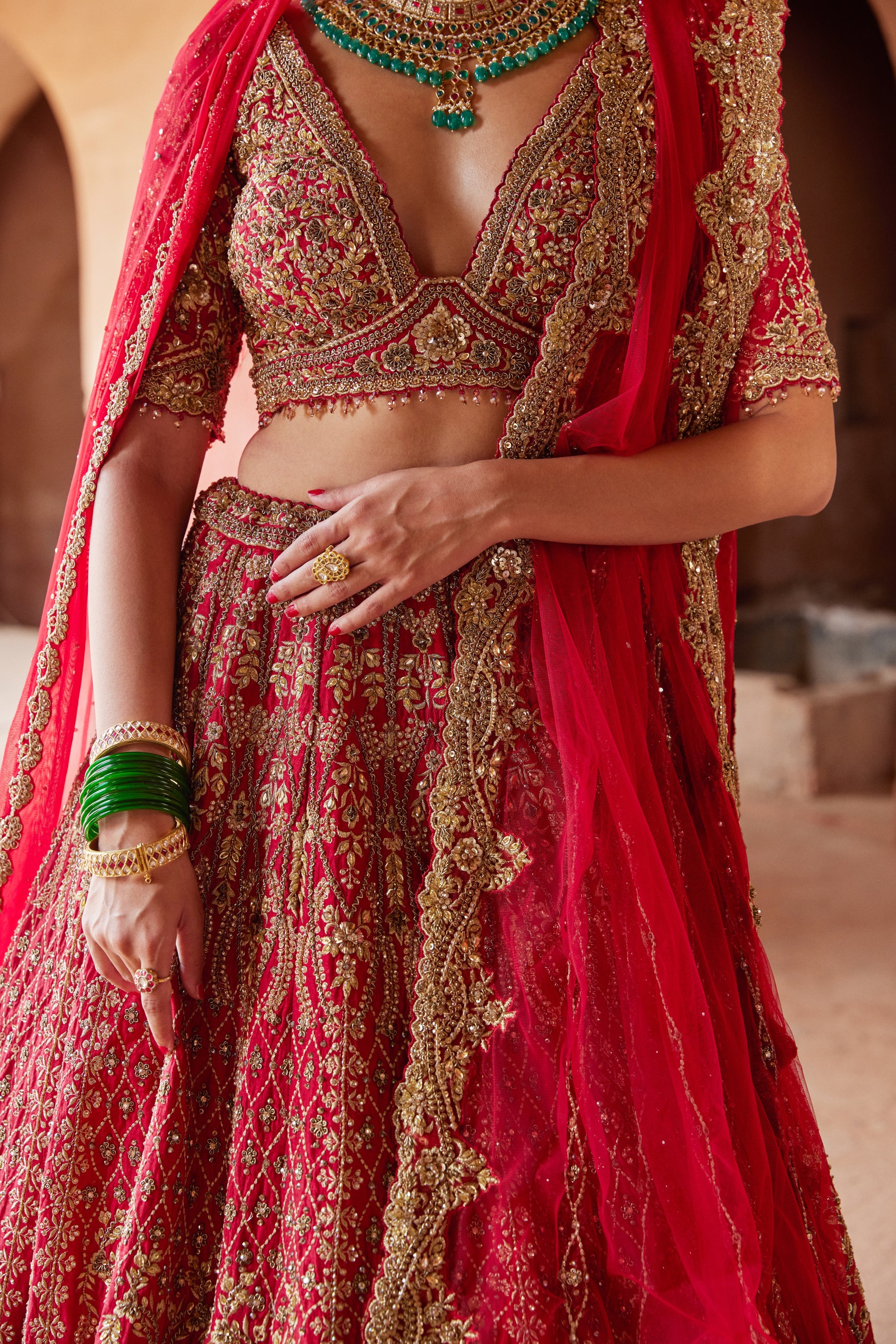 Capture timeless elegance with this blood-red raw silk lehenga choli, paired with a net dupatta adorned with intricate embroidery. Featuring antique kasab, dabka, shimmering sequins, beads, and radiant crystals, this ensemble is a masterpiece of opulence. Enhance your bridal look with an optional embroidered net veil, adding a regal and ethereal touch. Perfect for the bride who desires a blend of classic charm and luxurious detailing.
