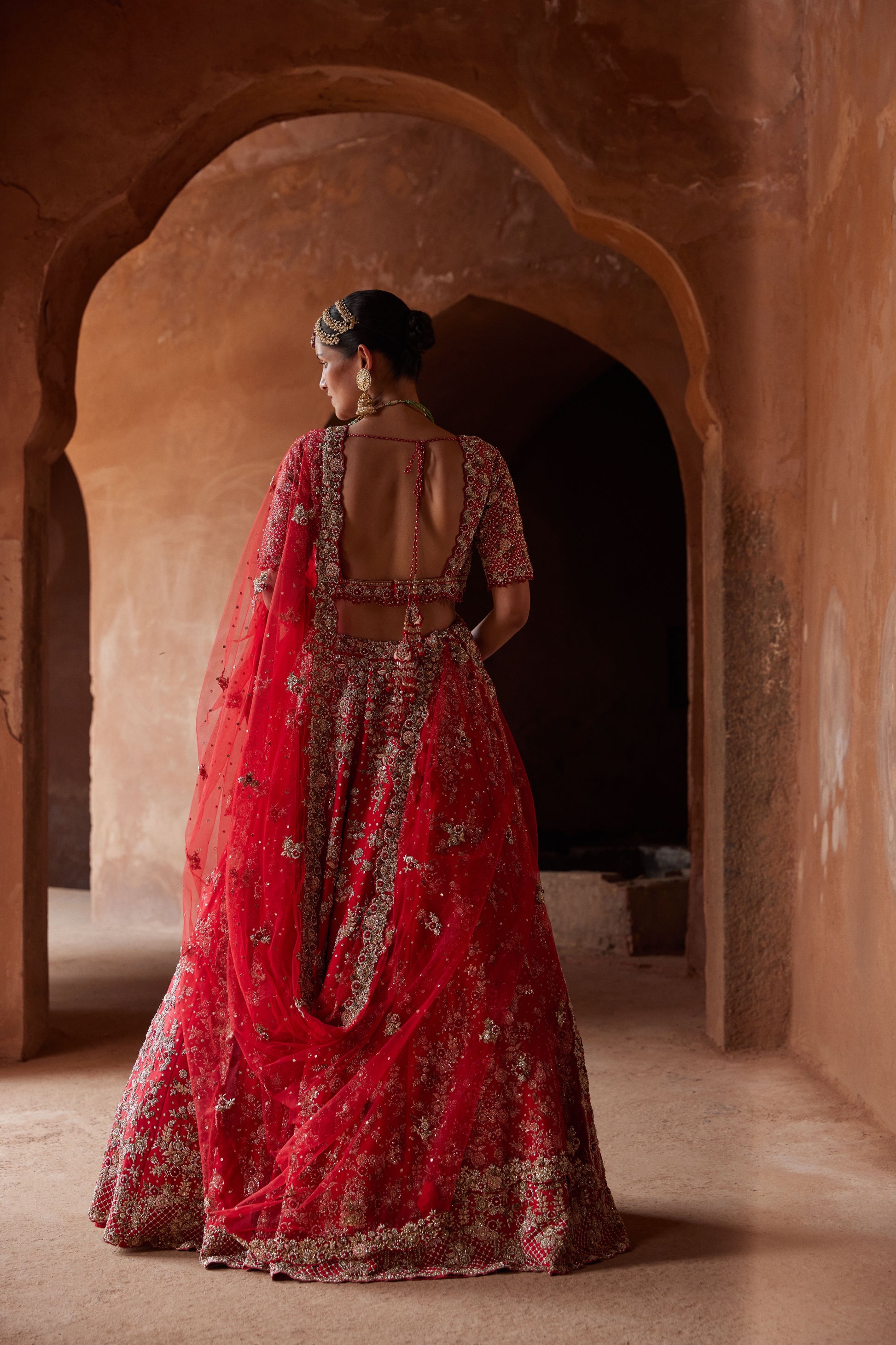 Exquisite crimson red raw silk lehenga choli set, paired with a delicately crafted net dupatta. Adorned with intricate floral embroidery, the ensemble features fine dabka work, contrasting resha threads, shimmering kasab detailing, sequins, beads, and radiant crystals. A masterpiece of craftsmanship, this outfit embodies the perfect blend of tradition and modern opulence, making it a stunning choice for your special day.
