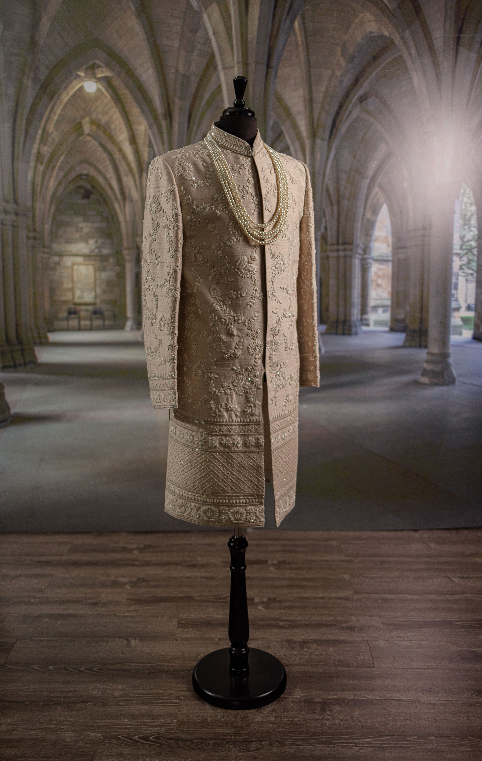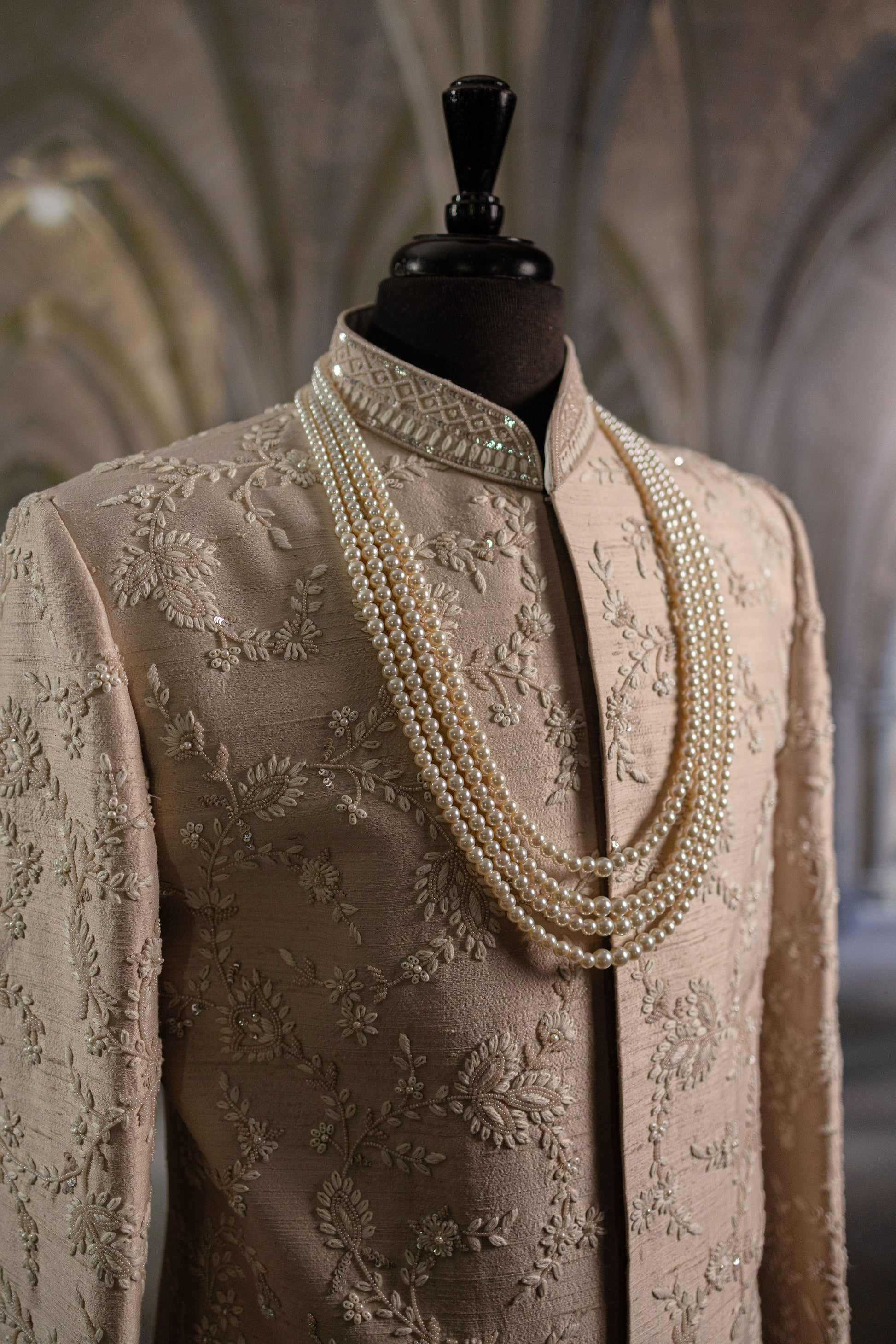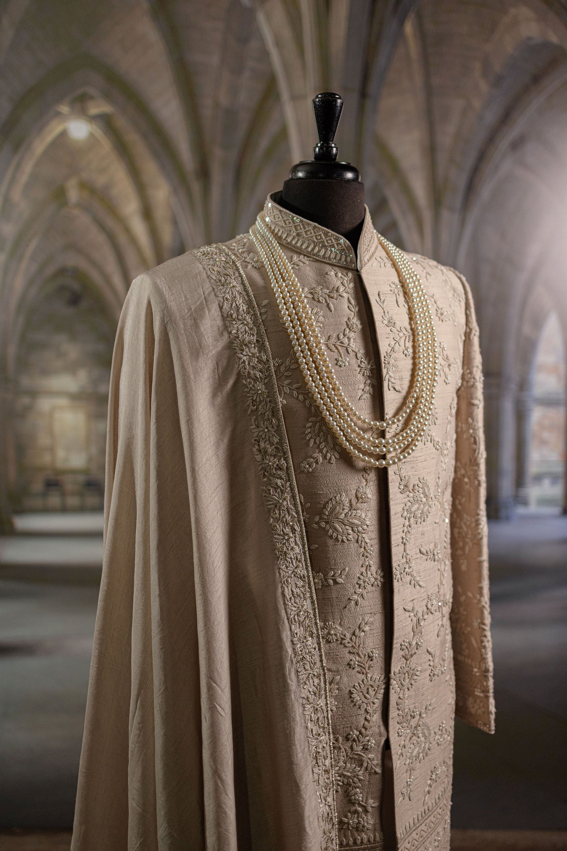 Our exquisite beige Sherwani, meticulously crafted with pearl hand embroidery. This opulent ensemble combines the richness of raw silk with the intricate artistry of pearl detailing, creating a masterpiece of elegance and style. Perfect for grand celebrations and cherished moments. Fully Customisable.