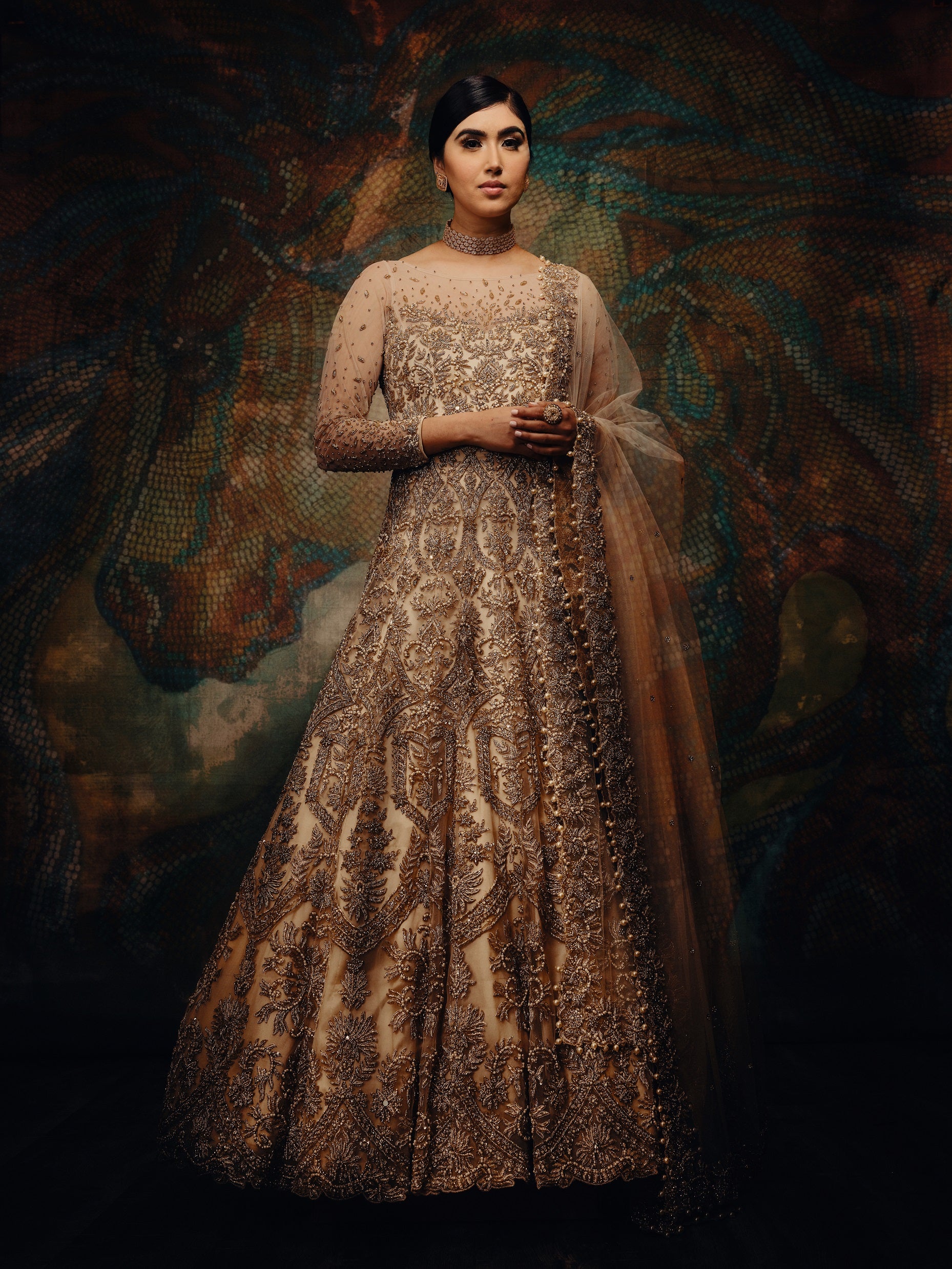 Champagne Gold Reception Gown with intricate zardozi work highlighted with pearls and topaz crystals