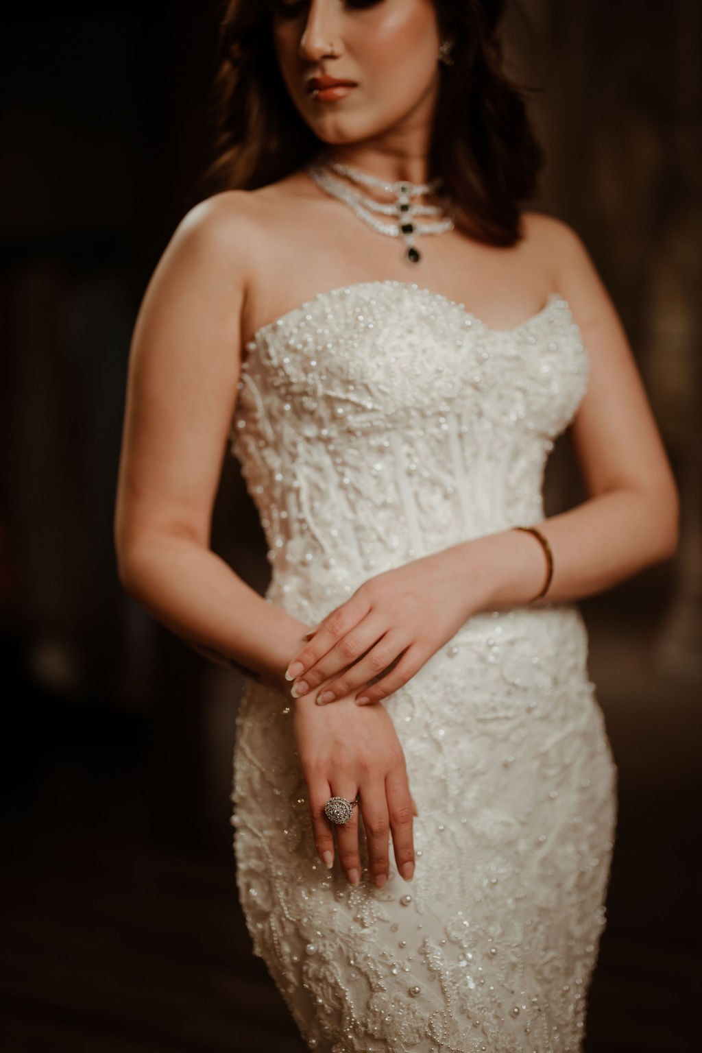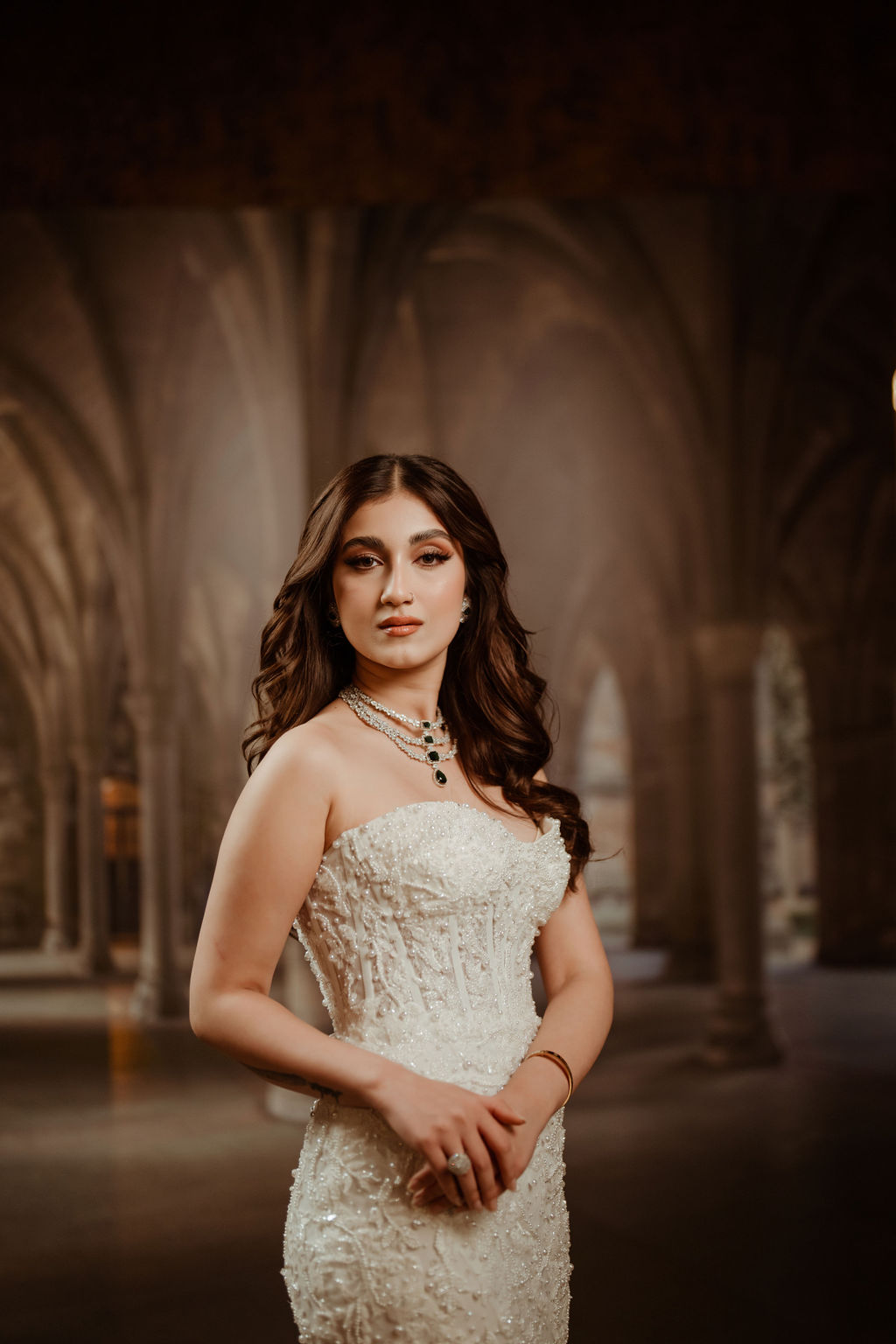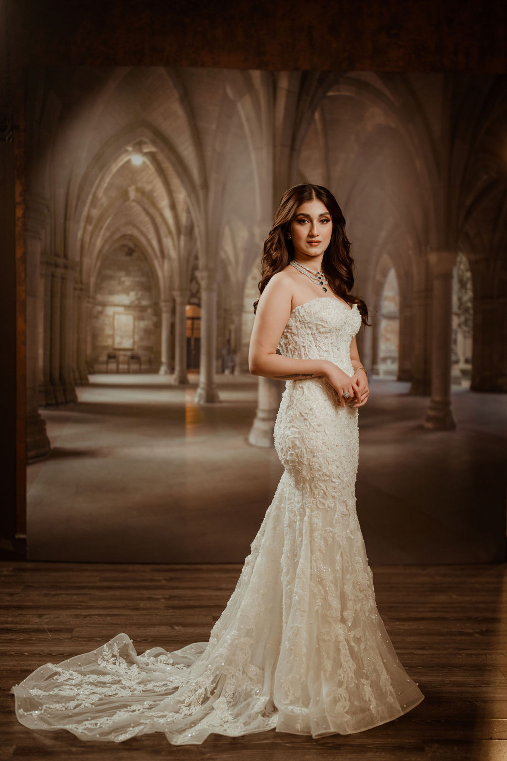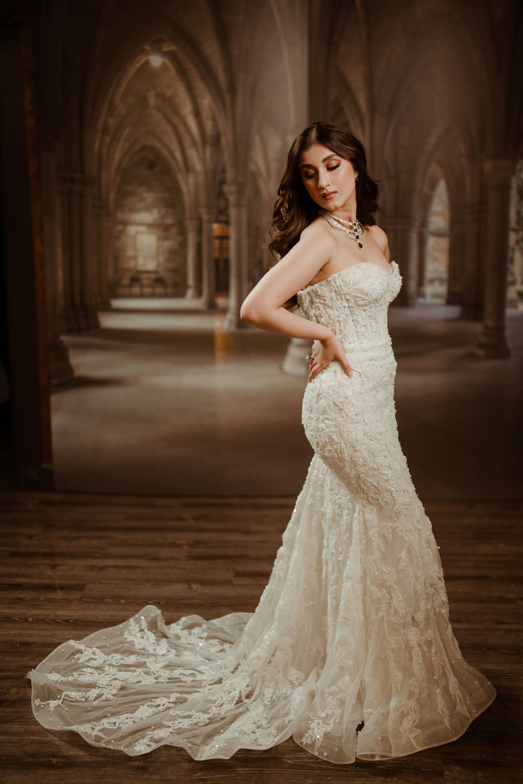 The gown's majestic silhouette is enhanced by a delicate trail, evoking a sense of celestial grace as you glide down the aisle. Each detail is meticulously crafted to create a mesmerizing ensemble that captures the essence of sophistication and romance.