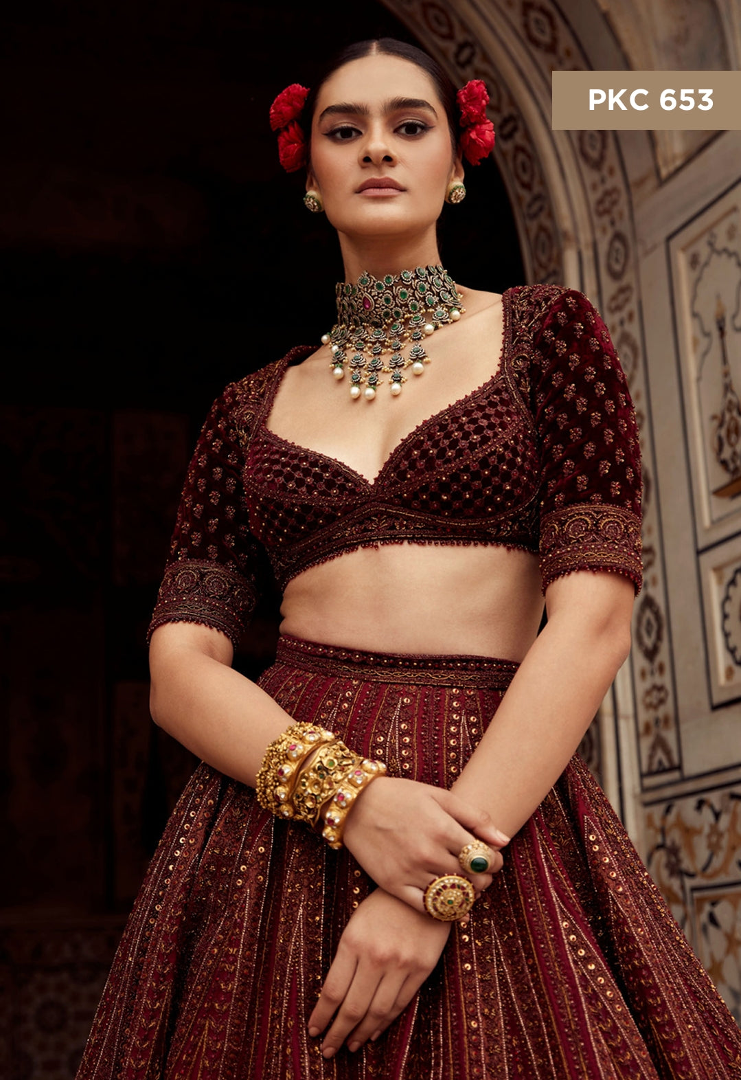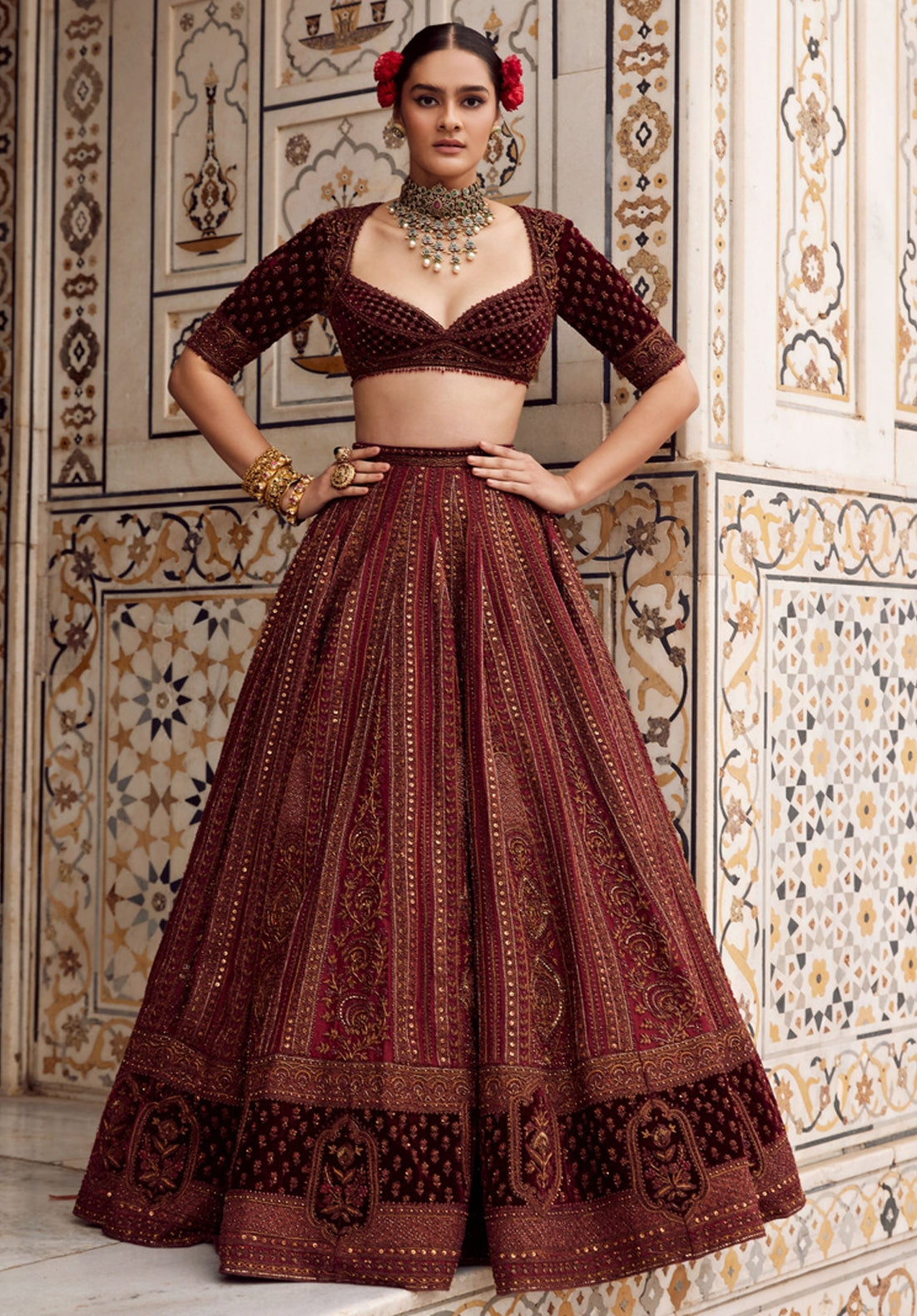Unveil timeless elegance with our Deep Maroon Tone-on-Tone Bridal Lehenga. The rich, deep maroon hue creates a luxurious and sophisticated look, enhanced by subtle tone-on-tone detailing that adds depth and texture. Crafted with the finest fabric and intricate craftsmanship, this lehenga offers a refined yet captivating aesthetic. Perfect for the bride who seeks a classic yet contemporary look, this piece radiates grace, beauty, and a sense of regal charm on your special day.