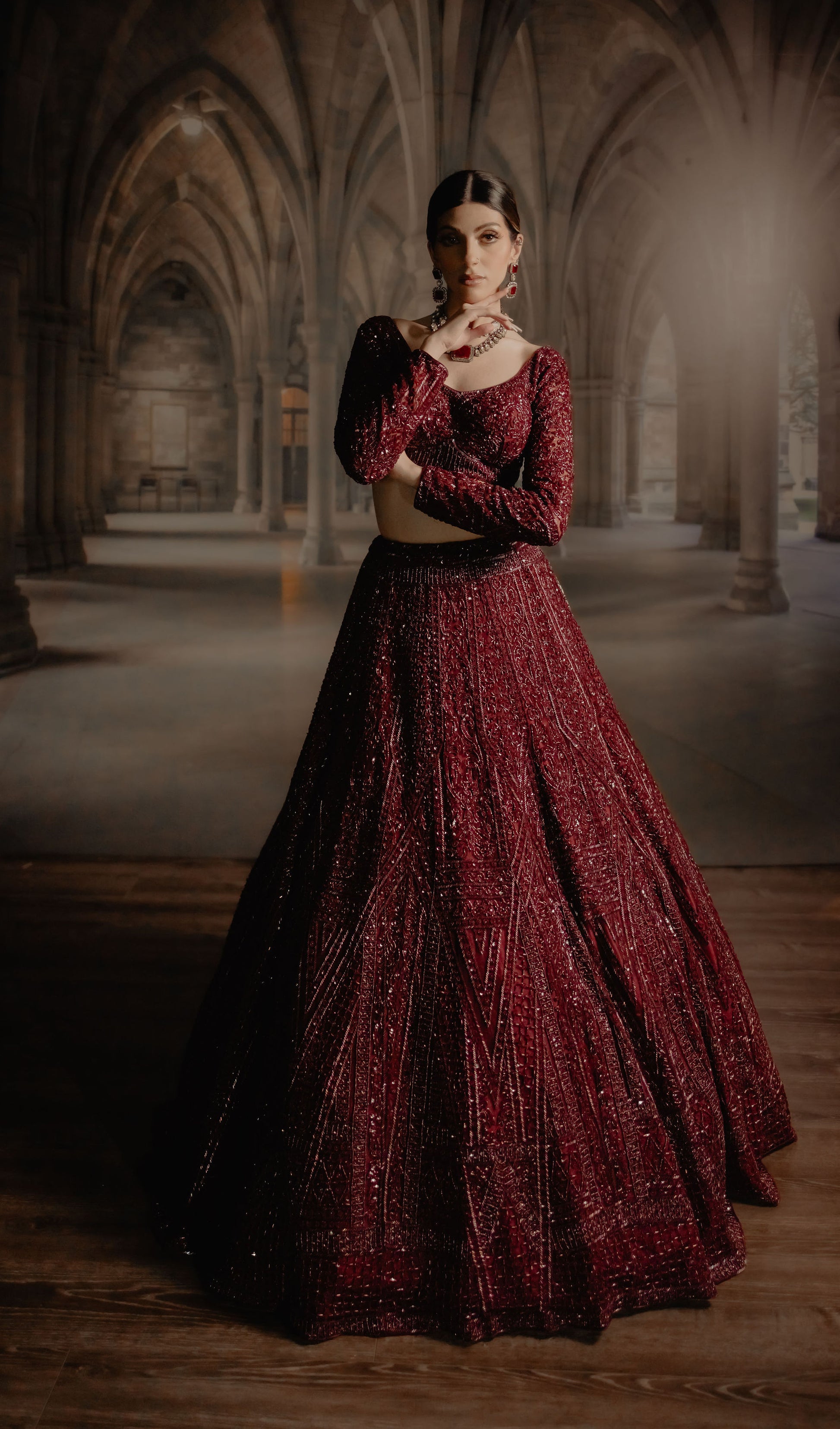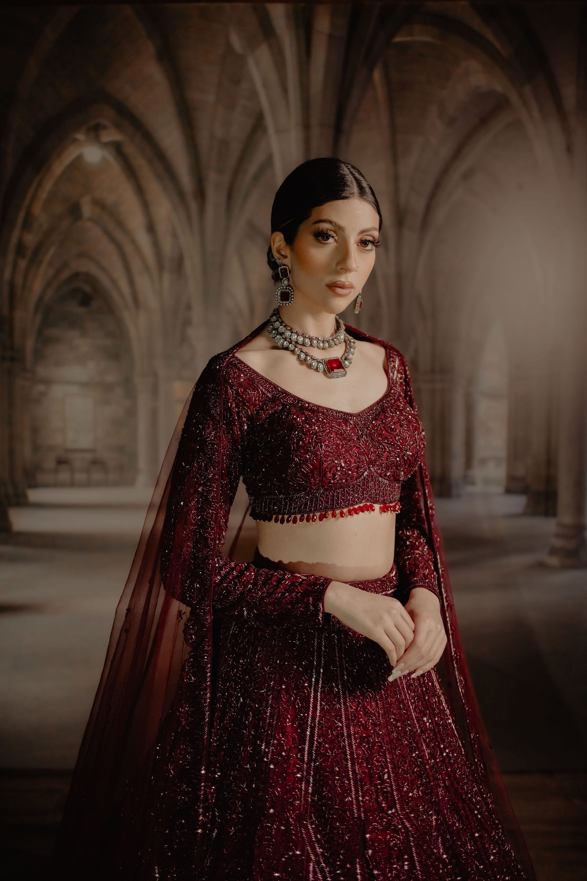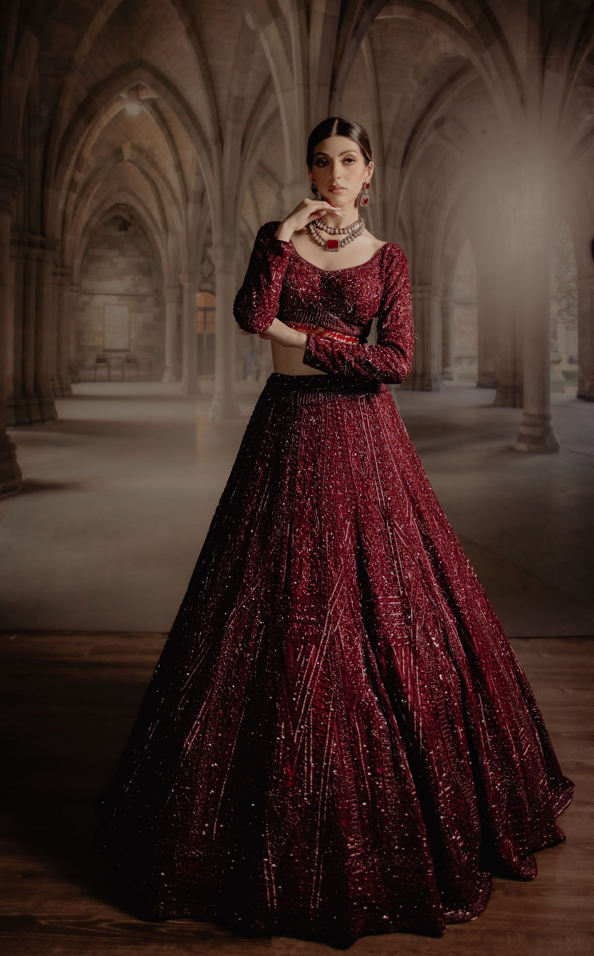 Introducing our Wine Reception Lehenga, a blend of traditional elegance and modern allure. Crafted from luxurious wine-colored fabric, this resplendent ensemble features handcrafted embroidery with cutdana, pearls, beads, and Swarovski crystals. Meticulously stitched by skilled artisans, each detail creates a mesmerizing tapestry of beauty and sophistication, ensuring a timeless and captivating look.