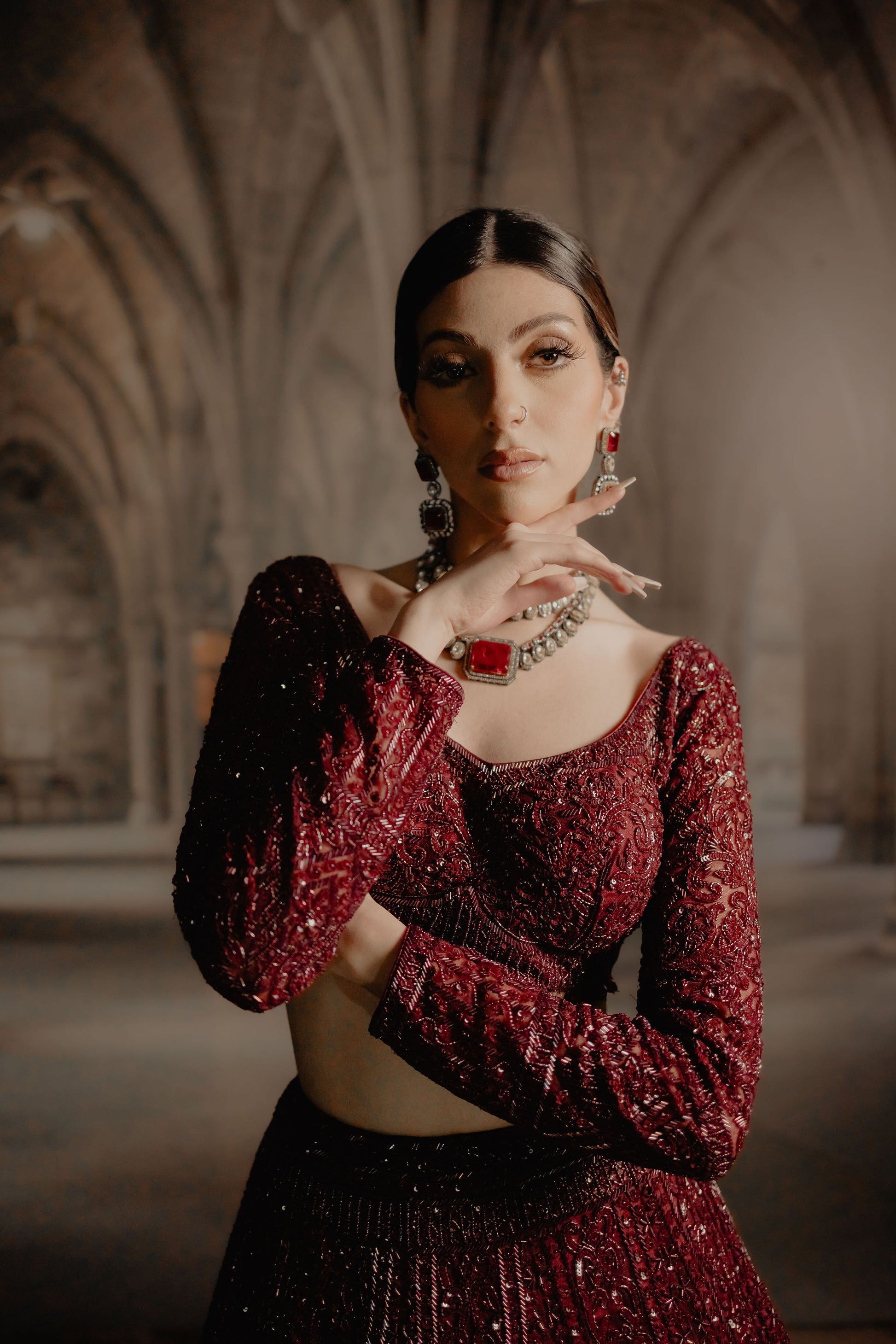 • Luxurious wine-colored fabric adorned with handcrafted embroidery