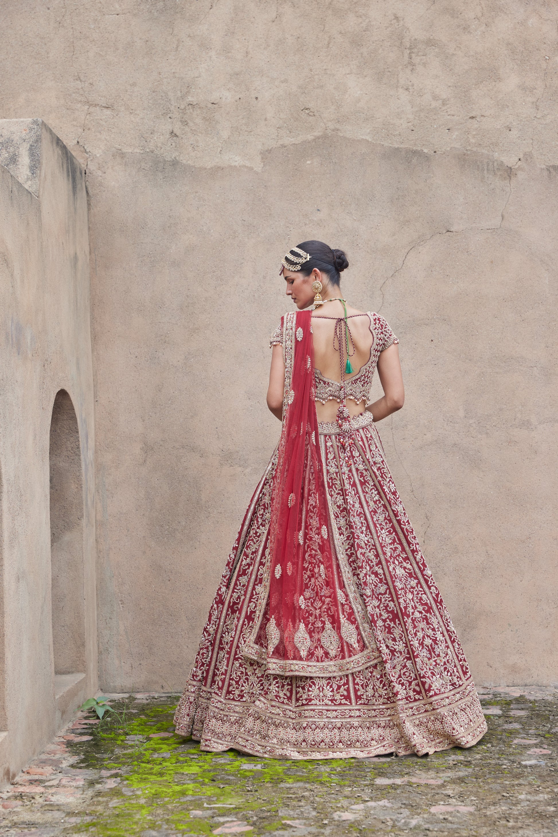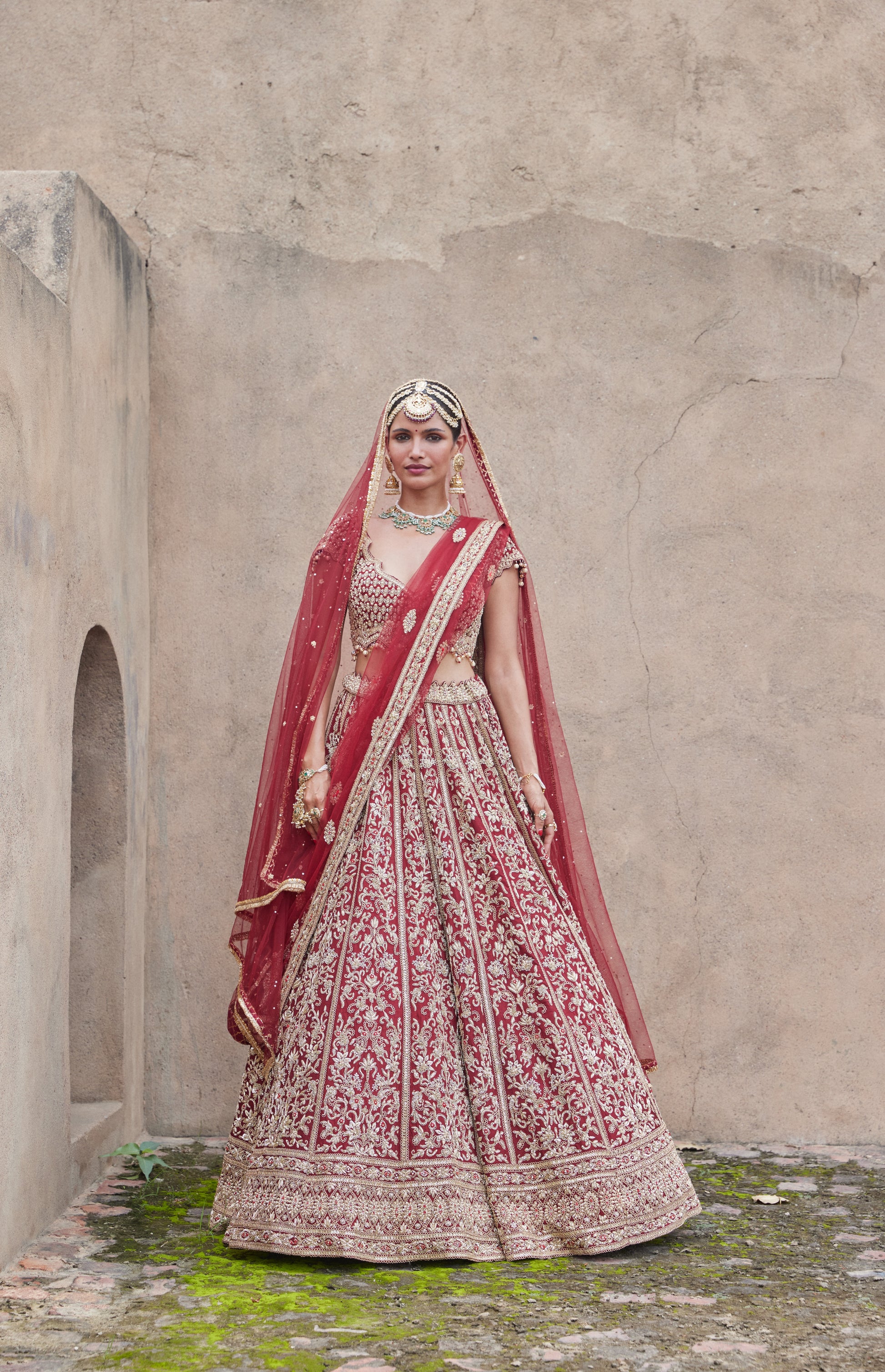 Exude royal elegance in this maroon velvet choli set, paired with a stunning net dupatta intricately embroidered in panels of fine zardozi. Featuring exquisite dabka, shimmering kasab, sequins, beads, and crystals, this ensemble is a masterpiece of timeless craftsmanship. Enhance your bridal look with the optional worked net veil, adding an ethereal touch of sophistication to this luxurious outfit. Perfect for the bride who seeks grandeur and tradition for her special day.