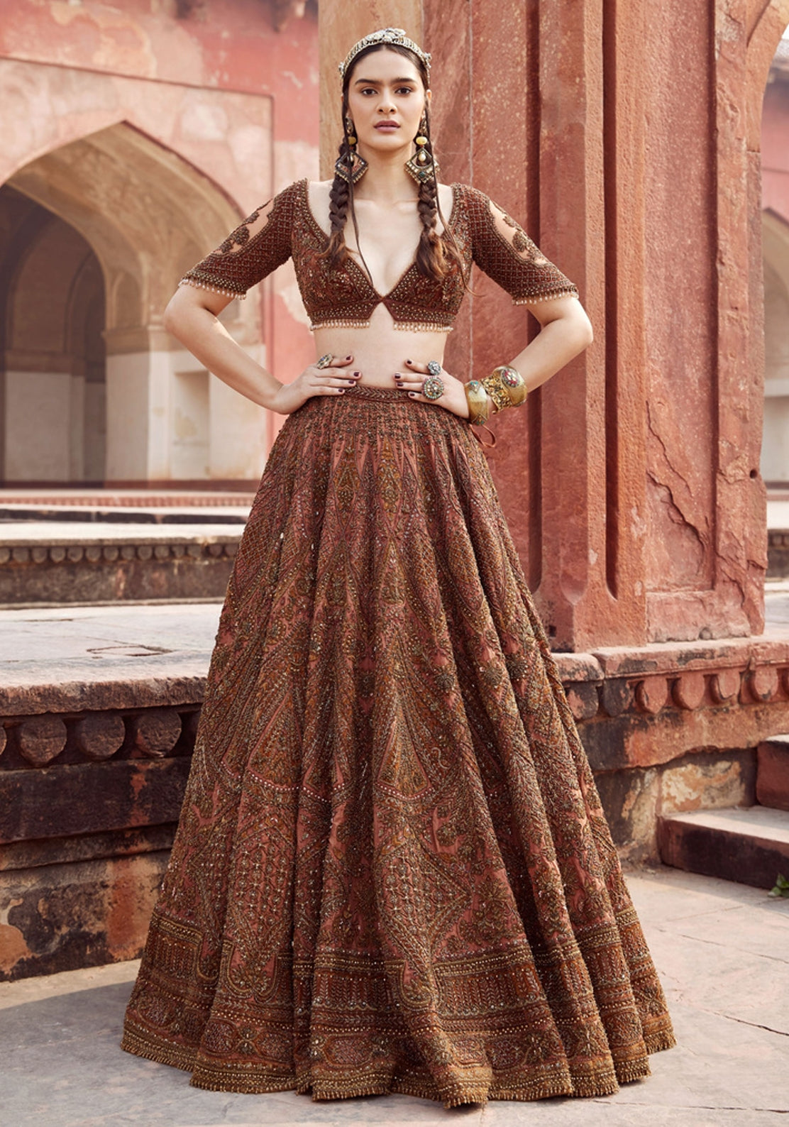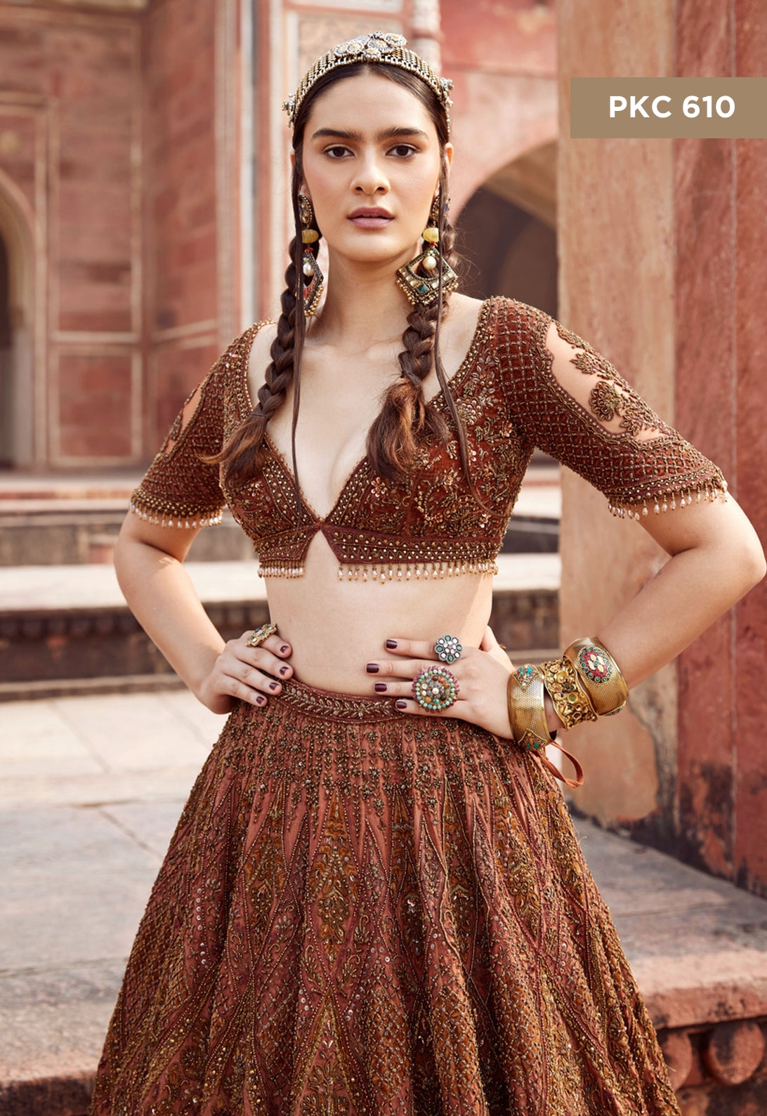 Exude understated elegance with our Brown Tone-on-Tone Embroidered Bridal Lehenga. The rich brown hue, paired with intricate tone-on-tone embroidery, creates a beautifully layered effect that is both sophisticated and timeless. Crafted with luxurious fabric and exquisite attention to detail, this lehenga offers a unique blend of classic charm and modern refinement. Perfect for the bride who values subtle beauty and elegance, this piece is designed to make a quiet yet unforgettable statement on your special day.