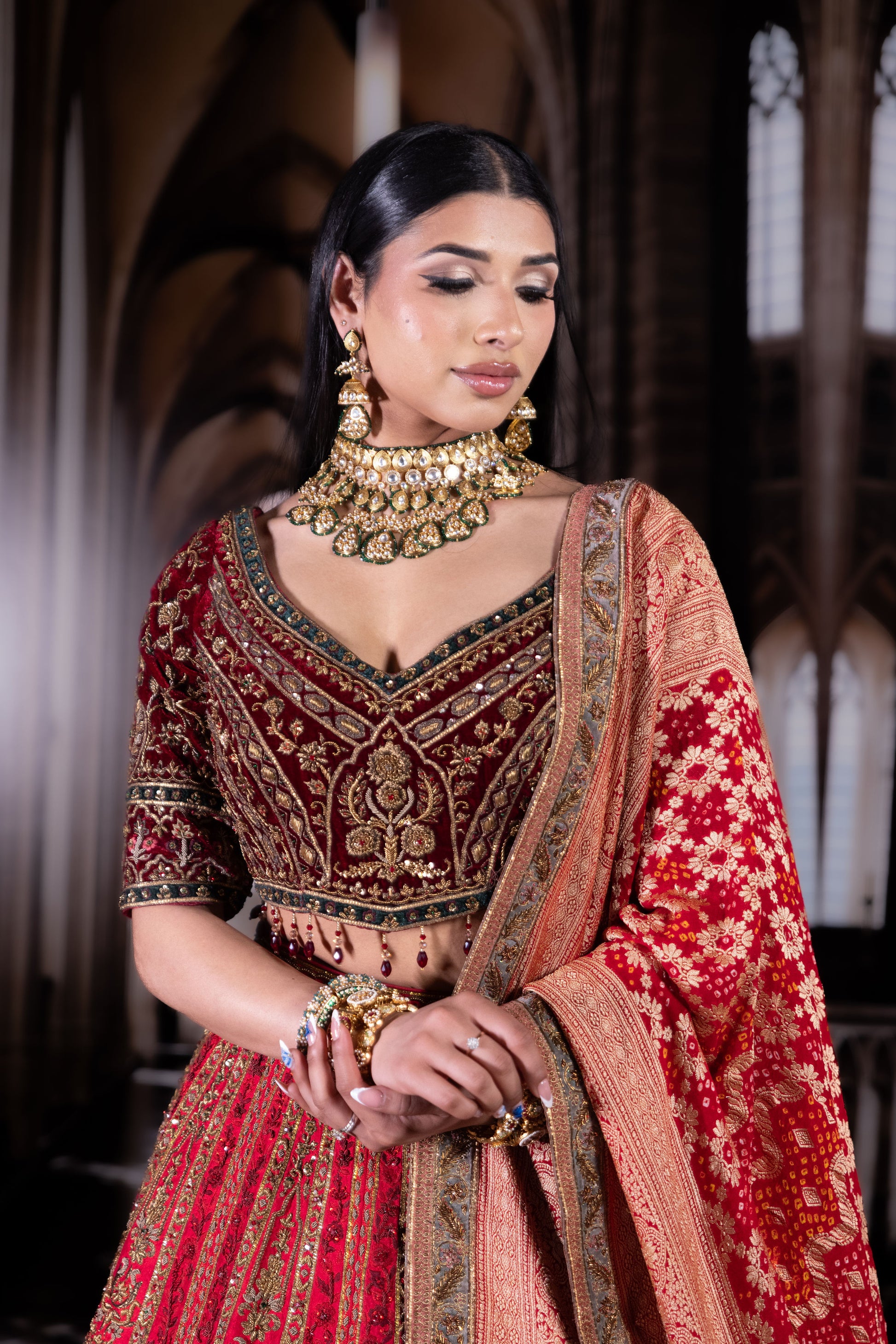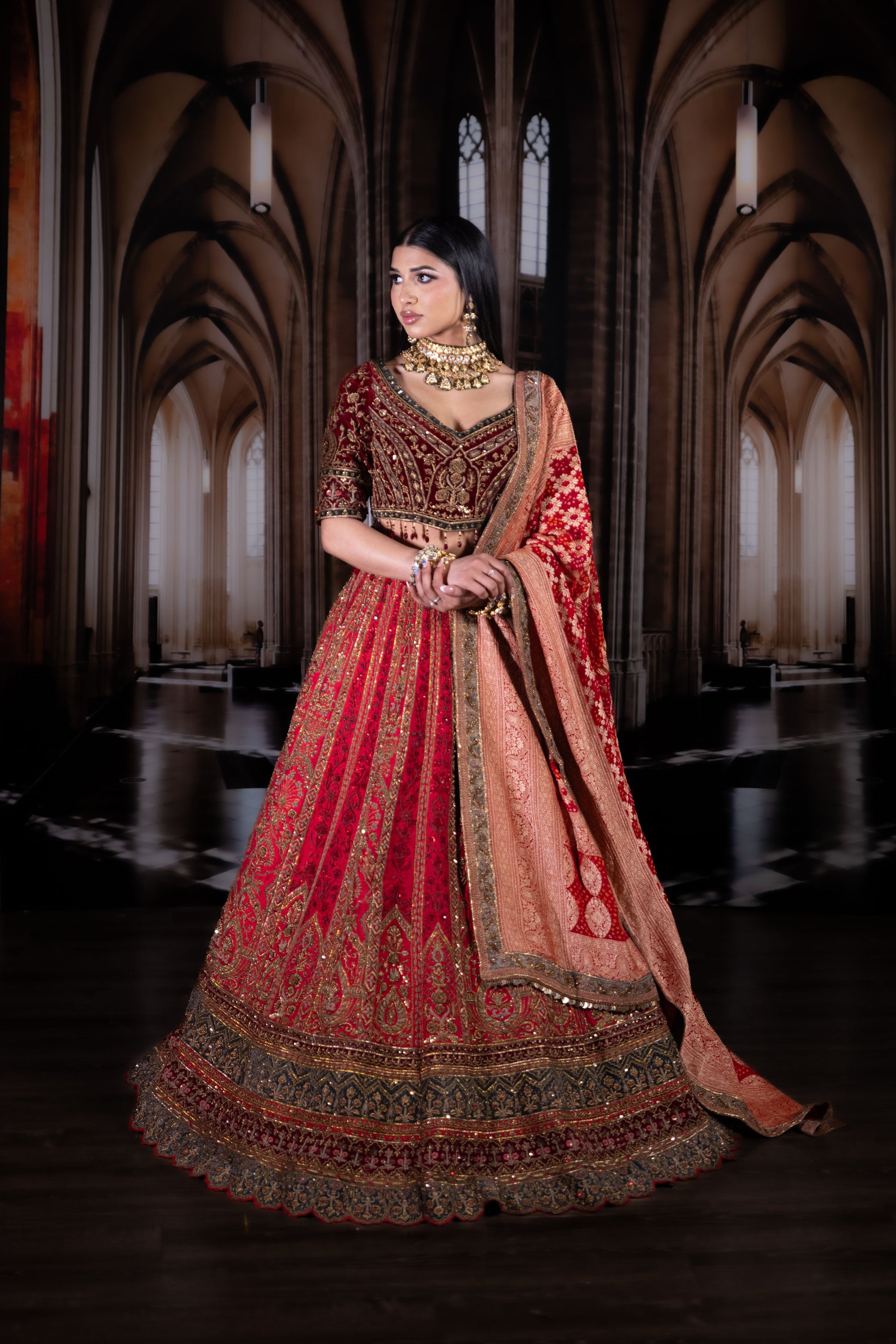 This true red lehenga features intricate panel work with a perfect amount of negative space on a raw silk base and paired with a luxurious velvet top. The border is adorned with velvet applique, adding depth and texture. A touch of emerald green enhances the design, creating a stunning contrast. This ensemble combines elegance and modern charm.