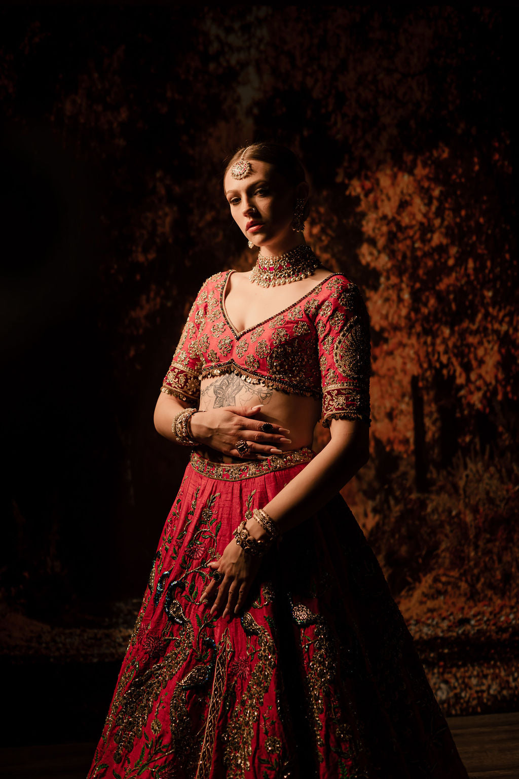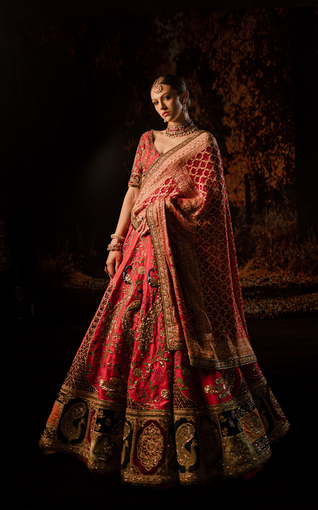 Turn heads on your special day with our vibrant Red bridal Lehenga, featuring stunning and intricate peacock embroidery that symbolizes grace and beauty. The bold, rich hues of this ensemble create a striking contrast, making it the perfect choice for the modern bride who wants to stand out in style. Crafted from premium fabric, it offers a flattering fit and exceptional comfort. Fully customizable, this Lehenga allows you to tailor every detail to reflect your unique style and ensure a perfect, personalized fit.