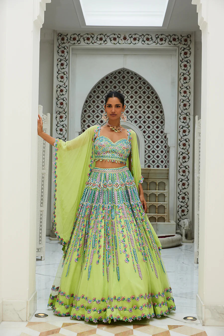 Lime Green Net Lehenga Choli With A Georgette Cape Embroidered With Multicoloured Resham And Patra Work.