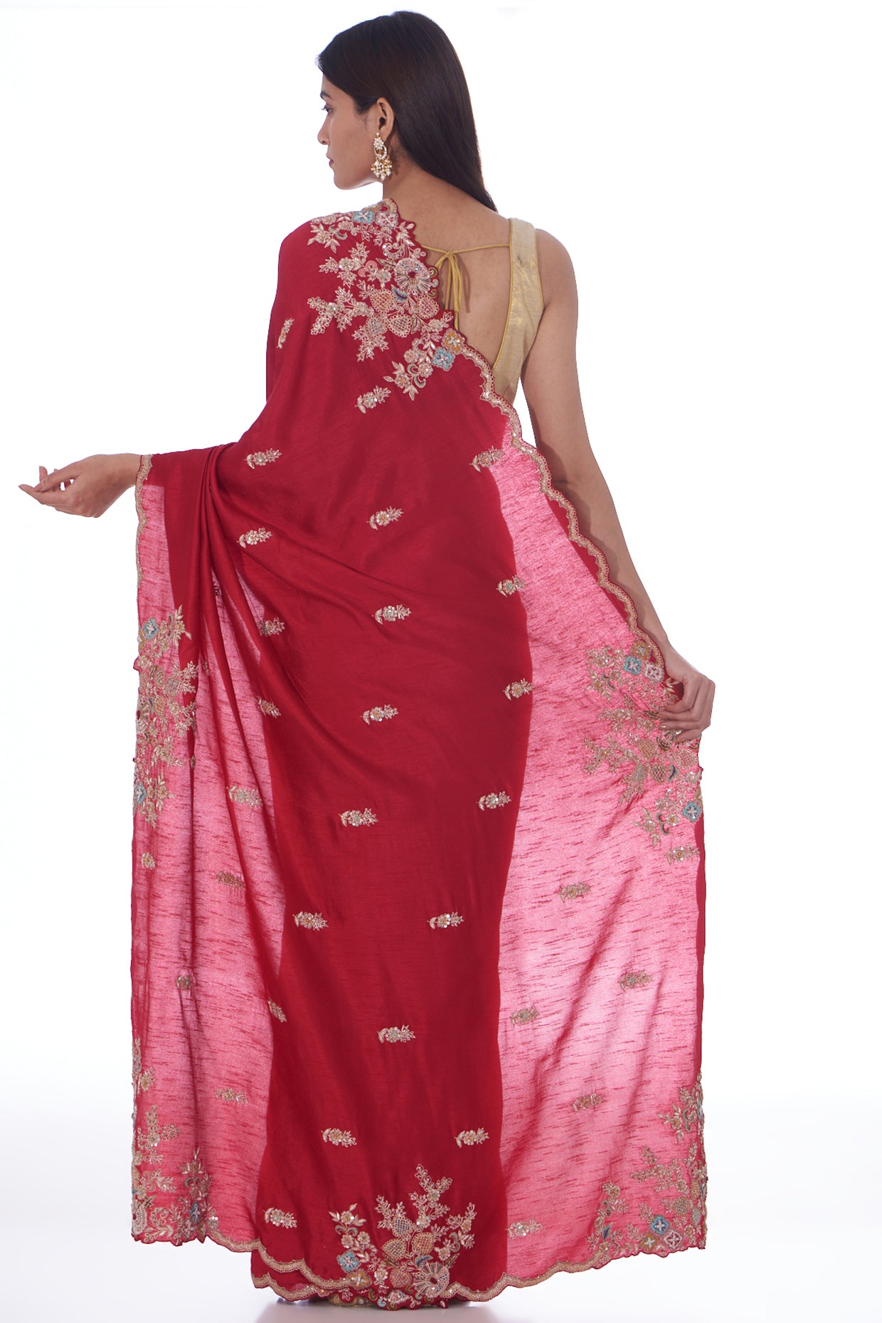 Red Saree In Tissue Organza Base With Sequins And Boota Work, Including A Scalloped Border. It Is Paired With A Matching Unstitched Blouse.