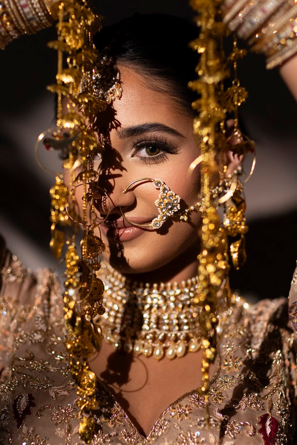 - Adorned with intricate gold embroidery, including Zardozi, Resham, Kundan, and Dabka workmanship