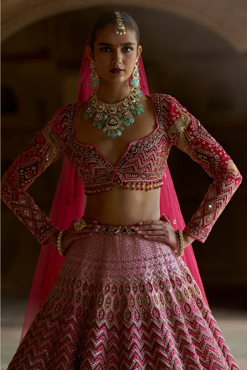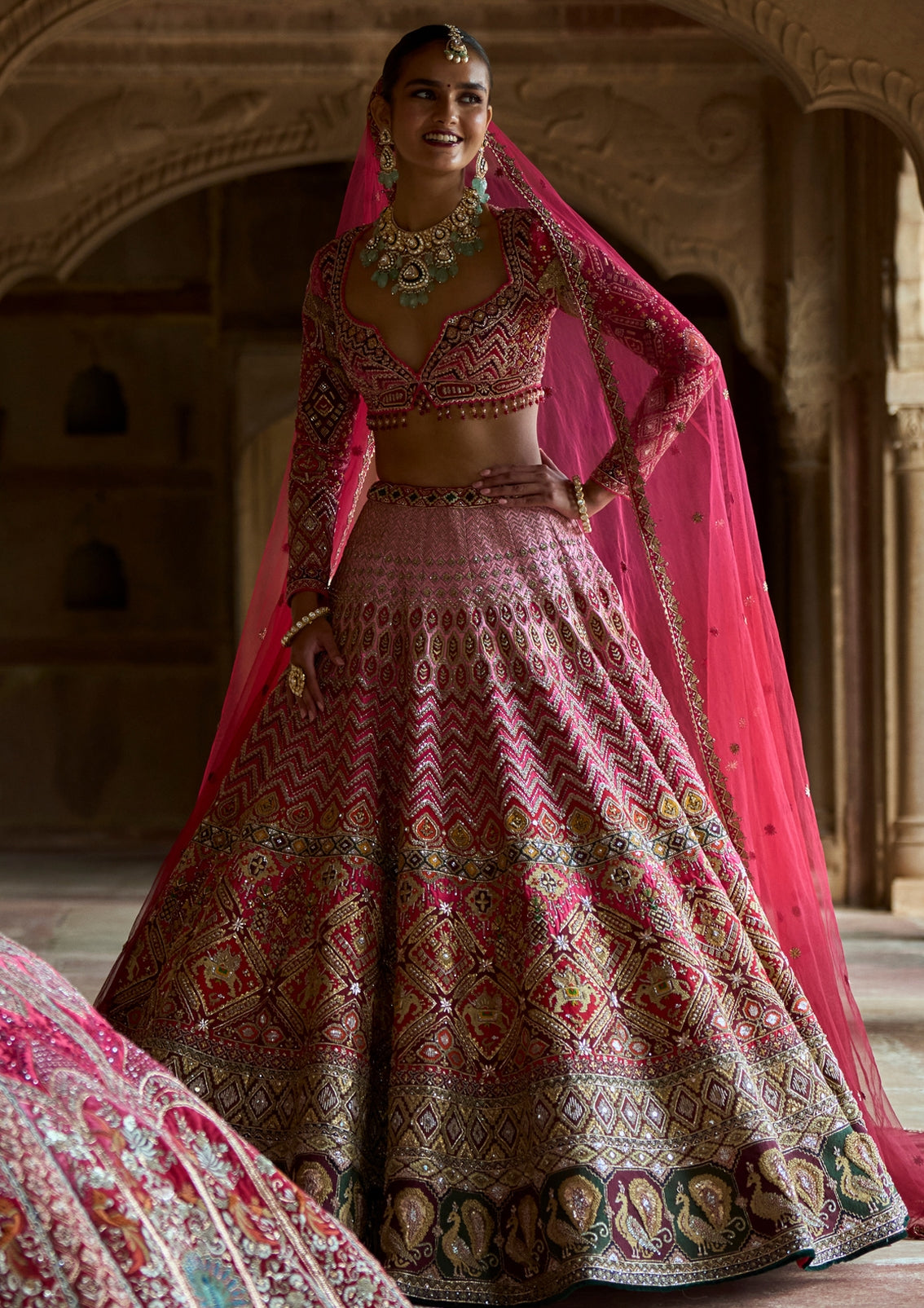 Make a bold, contemporary statement with our Pink Geometric Bridal Lehenga, where modern design meets traditional elegance. The striking geometric patterns add a fresh, artistic touch, while the peacock-embroidered motifs along the border bring an air of regal charm and cultural richness. Crafted from luxurious fabric, this lehenga exudes both style and grace, making it perfect for the bride who wants to celebrate her special day with a unique fusion of classic beauty and modern flair. Shine with sophistication and creativity as you step into a new chapter in this one-of-a-kind bridal ensemble.