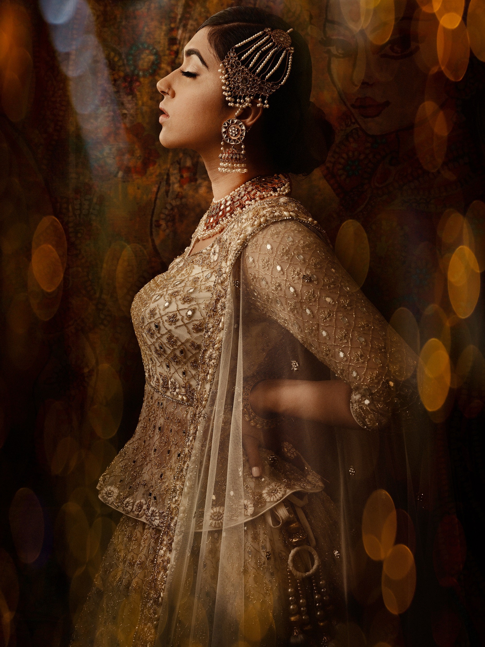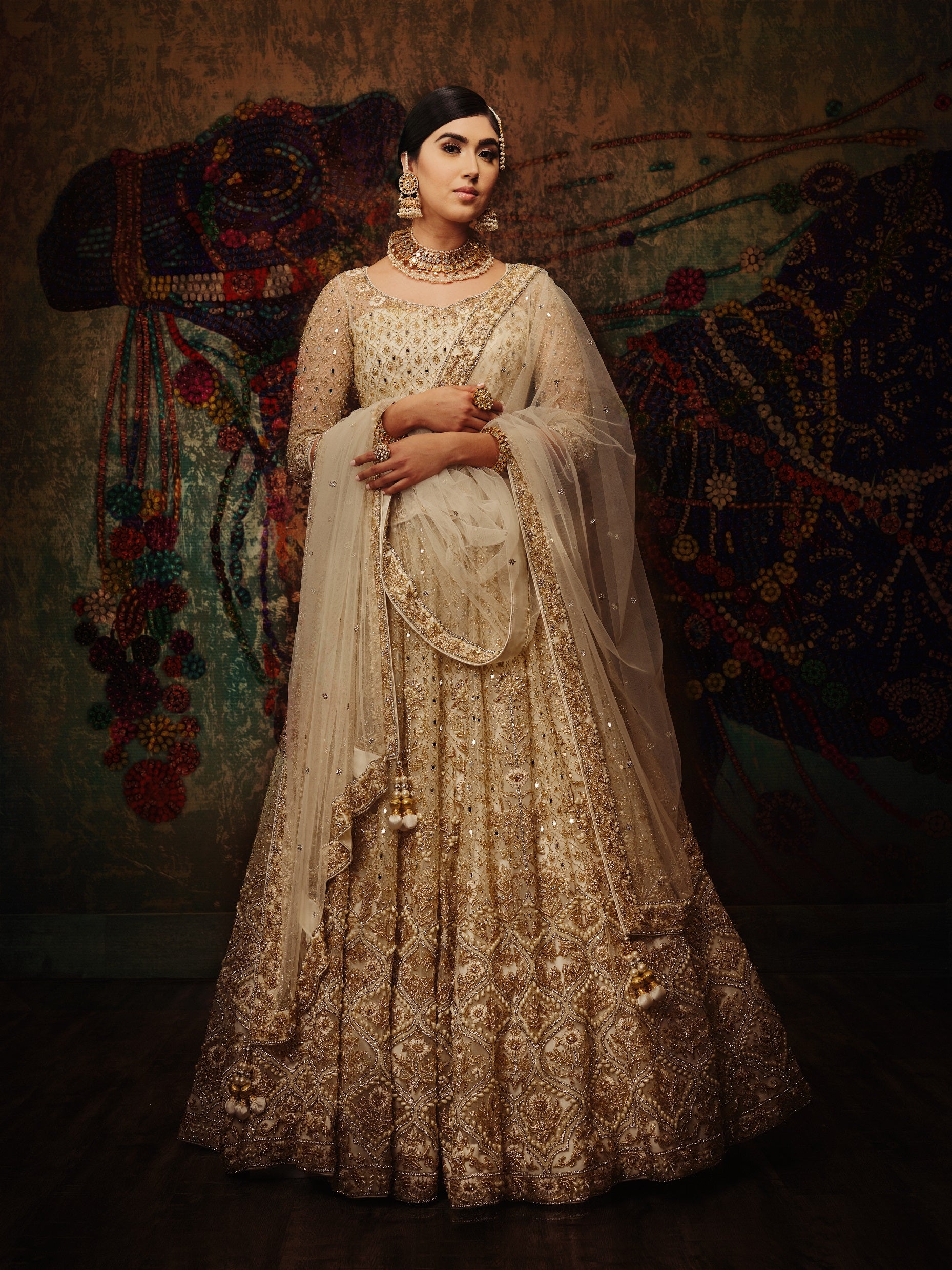 Offwhite peplum lengha with zardozi embroidery highlighted with pearl and mirror work