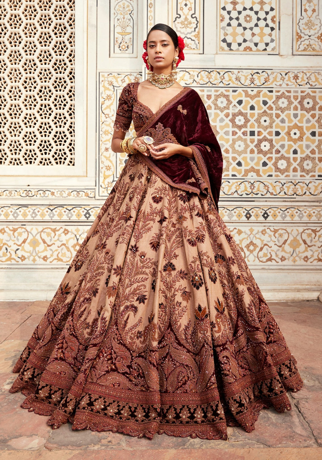 Embrace understated elegance with our Brown Bridal Lehenga, featuring delicate floral embroidery that adds a touch of romance and tradition. The rich brown hue exudes warmth and sophistication, while the intricate floral patterns bring a sense of timeless beauty to this luxurious piece. Crafted with care and attention to detail, this lehenga is perfect for the bride who seeks a refined yet striking look. Celebrate your special day with a piece that radiates natural beauty, grace, and a connection to the earth’s elegance.