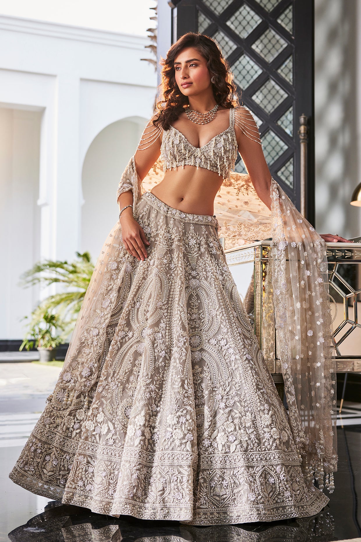 A Mesmerizing Grey Lehenga Set That Captivates With Its Elegance. The Eye-Catching Lehenga Is Crafted In Organza With Hand Embroidery. It Is Paired With An Embroidered Blouse Having A Sweetheart Neckline And A Net Dupatta. Accessorize The Designer Lehenga Set With Statement Earrings And Heels For A Wedding Or Engagement Ceremony.