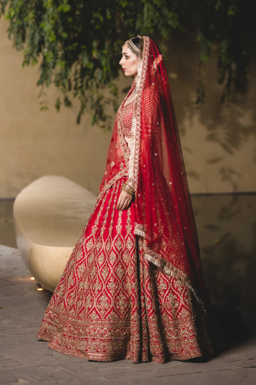 Scarlet silk lehenga choli with soft tulle dupatta & gold zari, finished with mokaish, resham, crystal & dabka embellishments. Comes with the option of an additional dupatta.