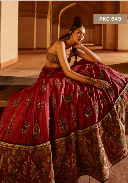 Renaz is a luxurious choice for the fashion-forward individual. Made with raw silk, this dark red lehenga boasts intricate detailing with beautiful zardozi handwork, creating a unique and eye-catching design.