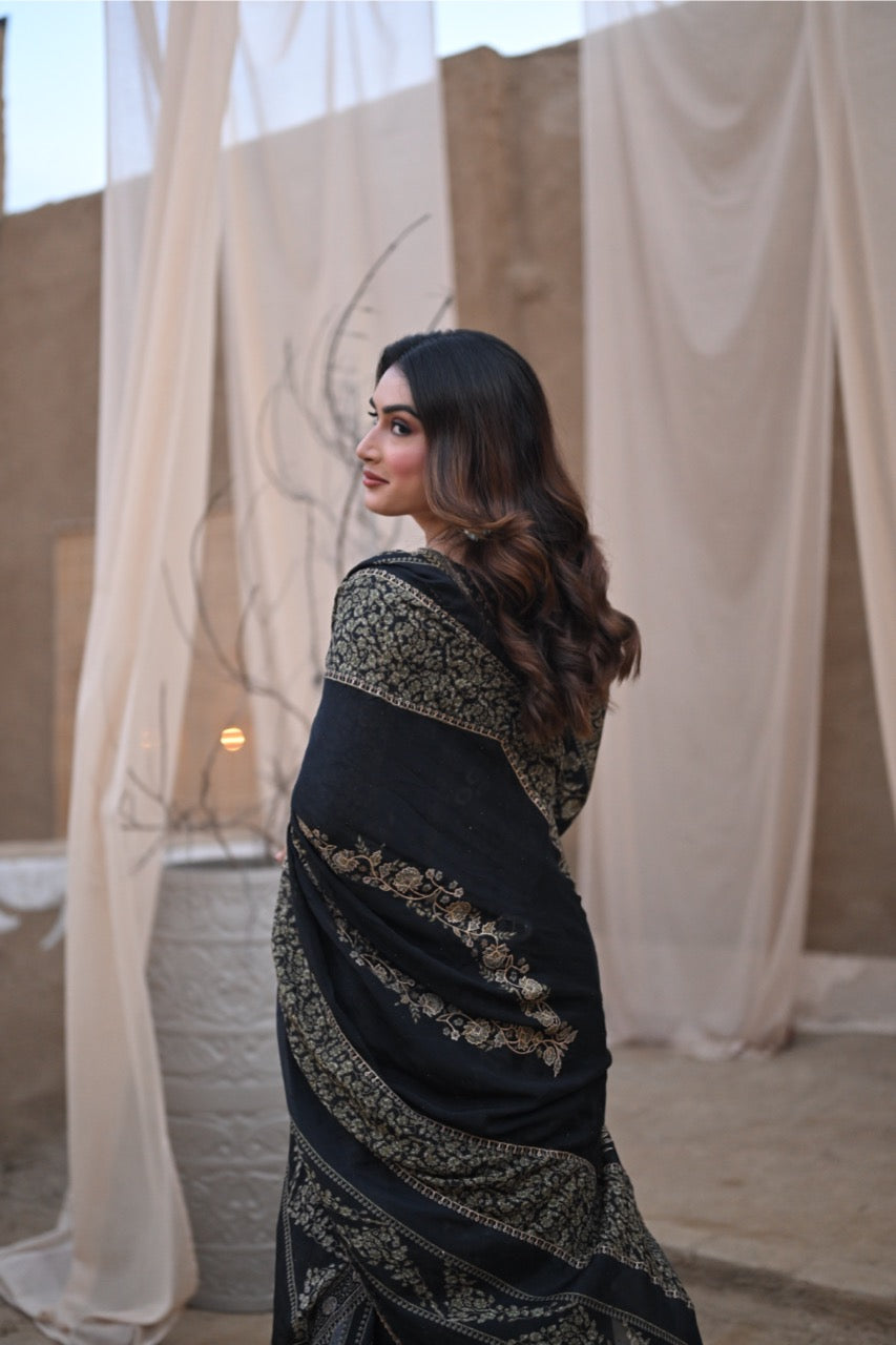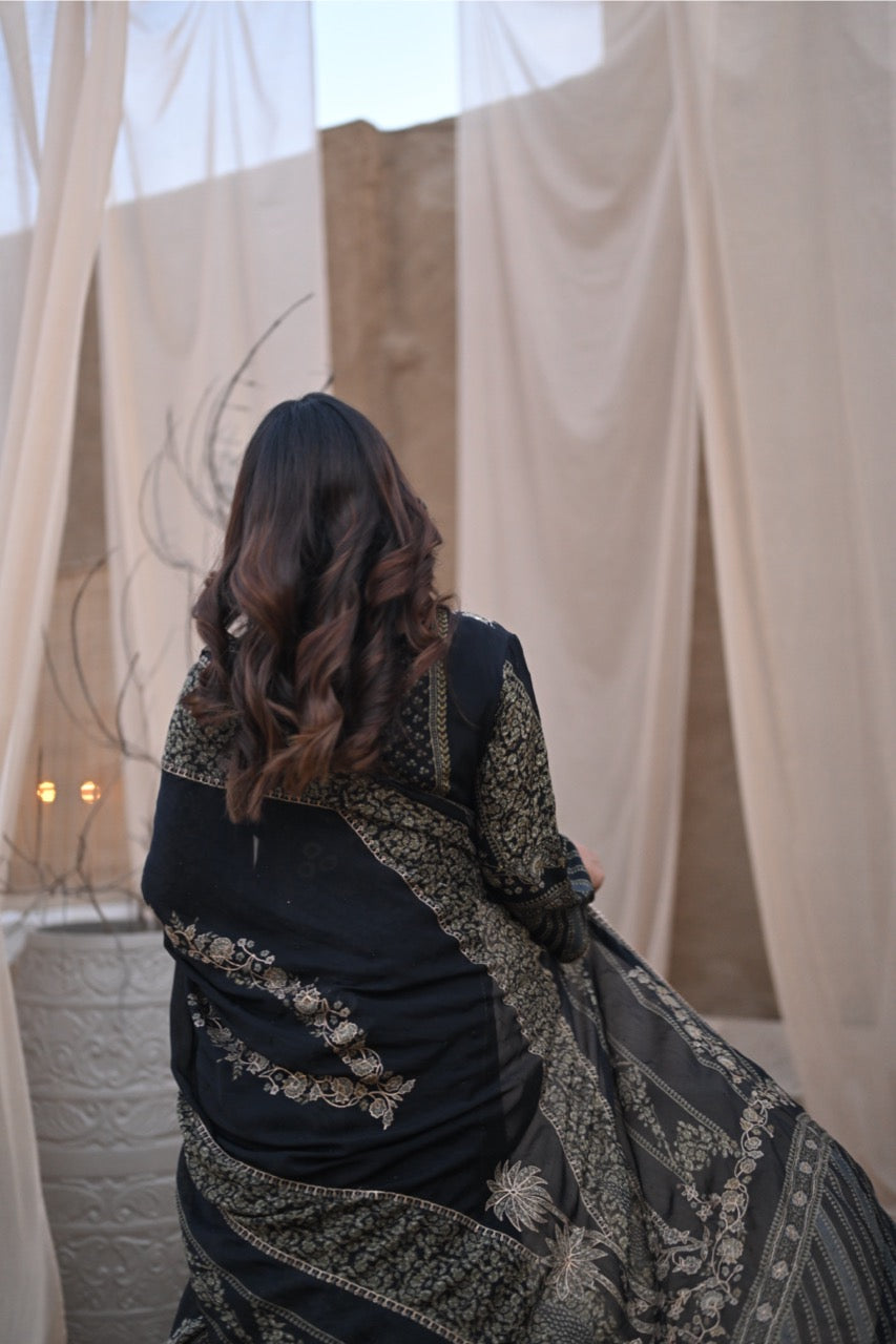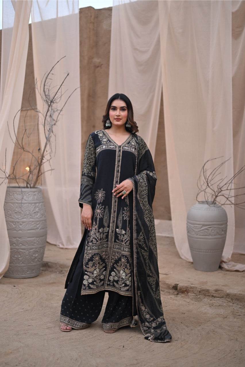 Black Indian suit featuring intricate silver embroidery. Perfect for any occasion, this ensemble blends tradition with modern elegance. The rich black fabric highlights the shimmering silver details, creating a captivating and sophisticated look. Fully customizable for a tailored fit, this suit ensures you feel confident and comfortable.