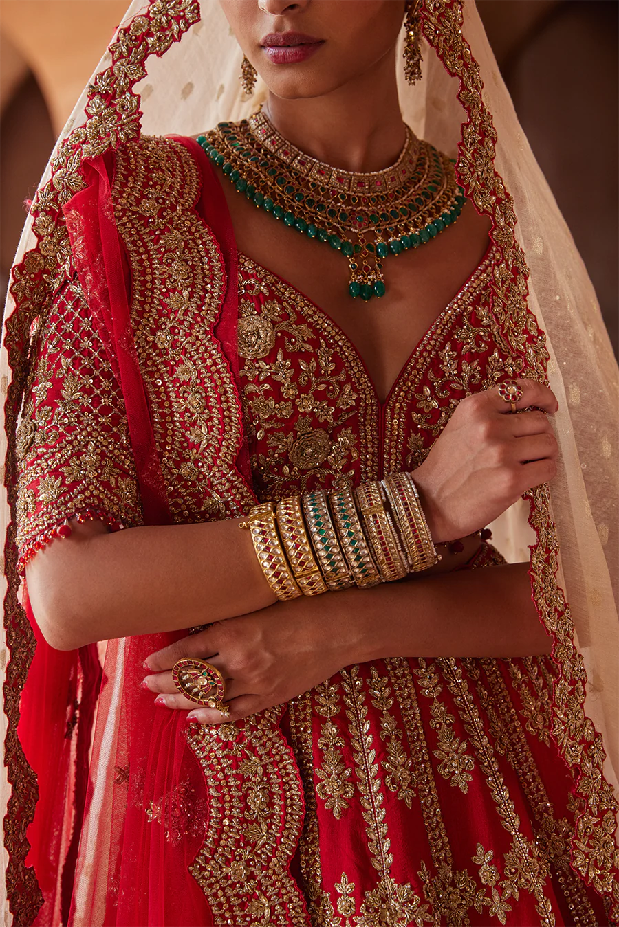 Scarlet Red Raw Silk Lehenga Choli Set With Scalloped Net Dupatta With 3-D Flowers Delicately Embroidered With Gold Zari, Dabka, Sequins, Beadwork And Crystals. The Ensemble Can Be Styled With An Additional Embroidered Gold Tissue Booti Dupatta.