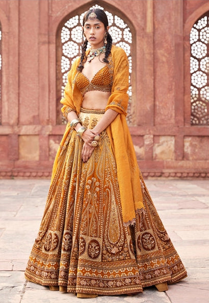 Introducing the Riza-PKC 620, a stunning mustard yellow lehenga with a V-neck, polka dot blouse. This elegant piece is adorned with intricate embroidery, providing a vibrant and warm feel.  Elevate your style with this timeless ensemble.