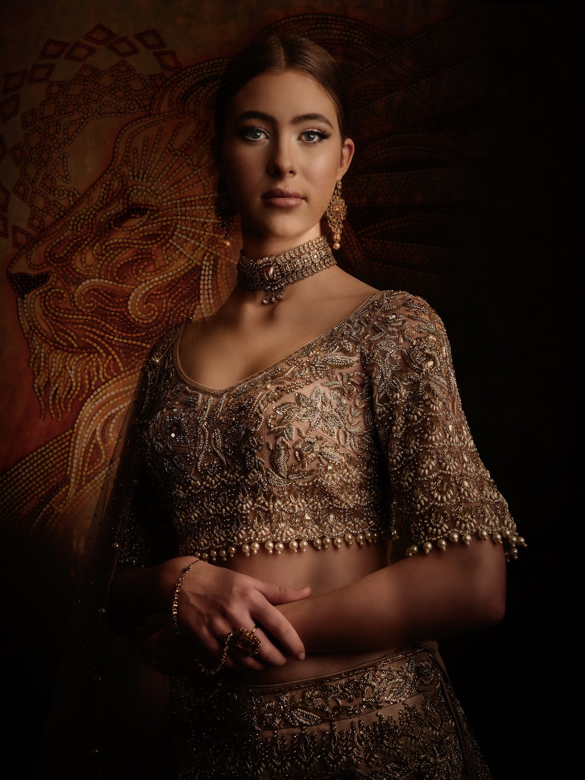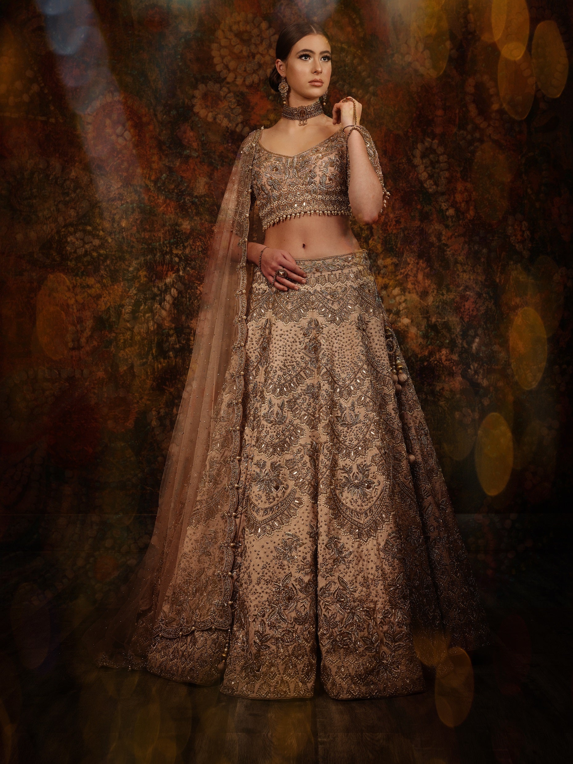 Rosegold Scalloped Pattern Lehenga highlighted with pearls and topaz crystals