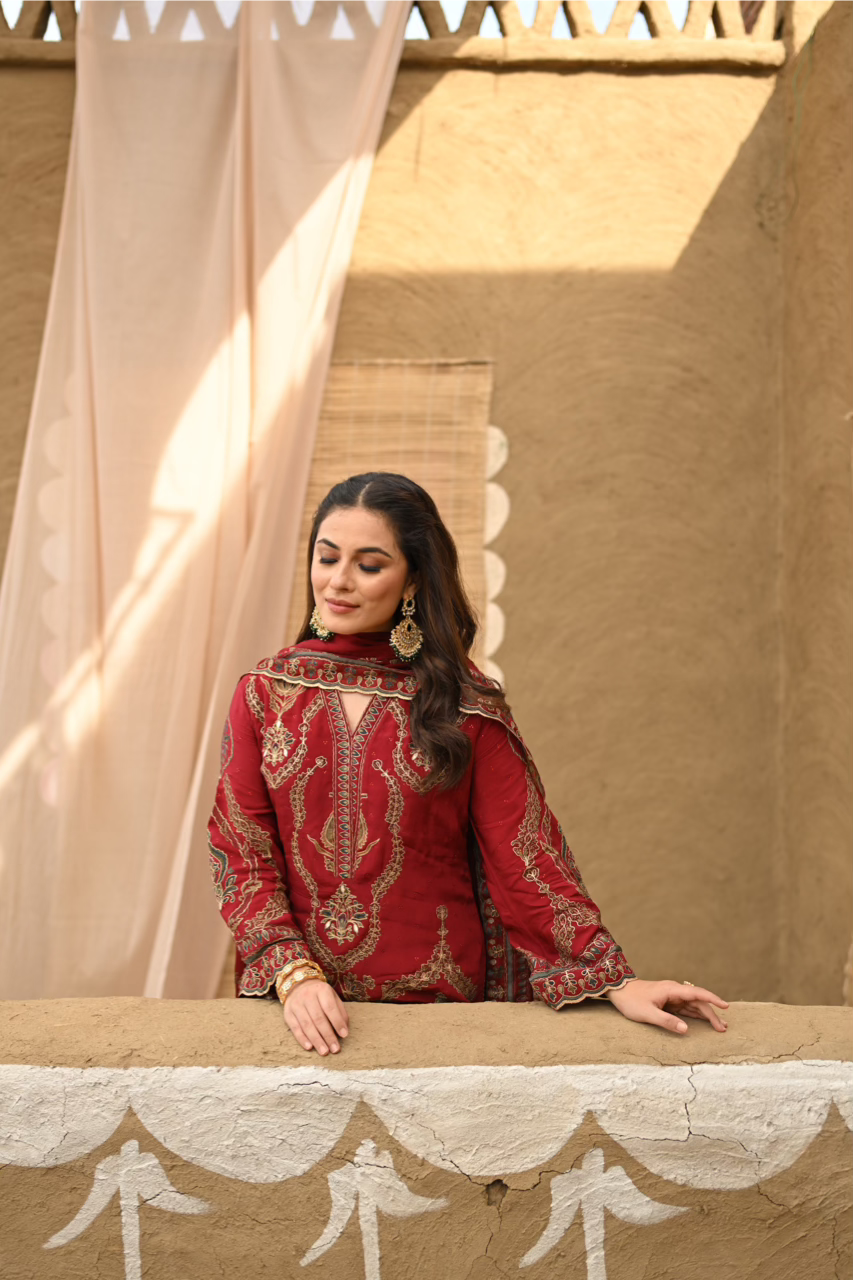 Embrace the essence of tradition with our stunning red Indian suit, designed to make a bold statement while honoring timeless craftsmanship. This exquisite ensemble features intricate floral embroidery, reminiscent of classic artistry, adding a touch of elegance and charm to your look. Crafted from luxurious fabric that drapes gracefully, it ensures comfort and style for any occasion, whether you're attending festive celebrations or intimate gatherings.