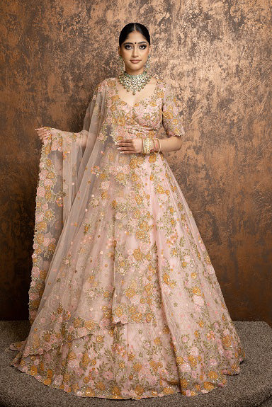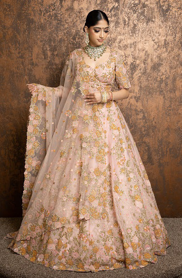 It's the effortless pink with yellow + green floral embroidery that makes this one of our timeless sangeet looks!