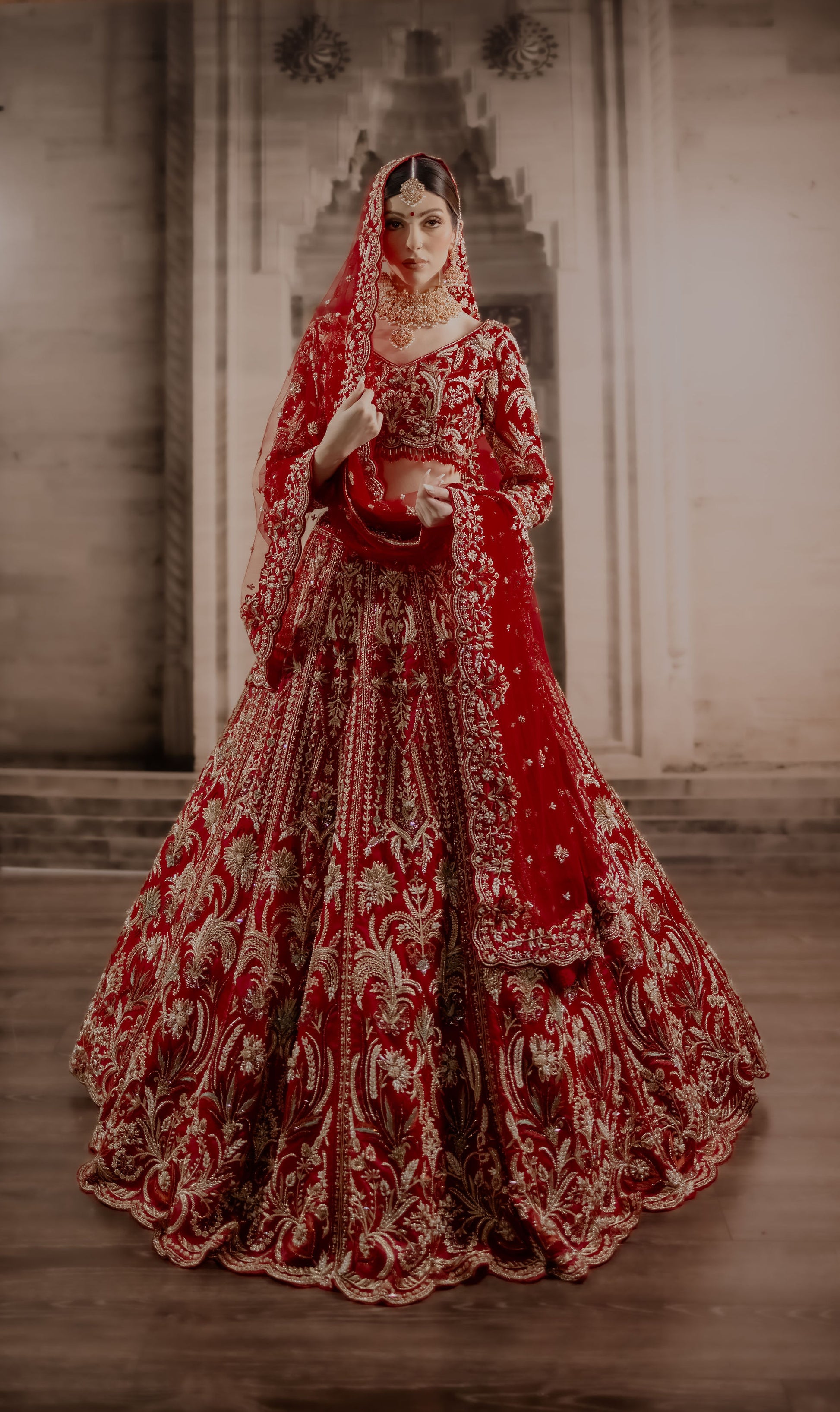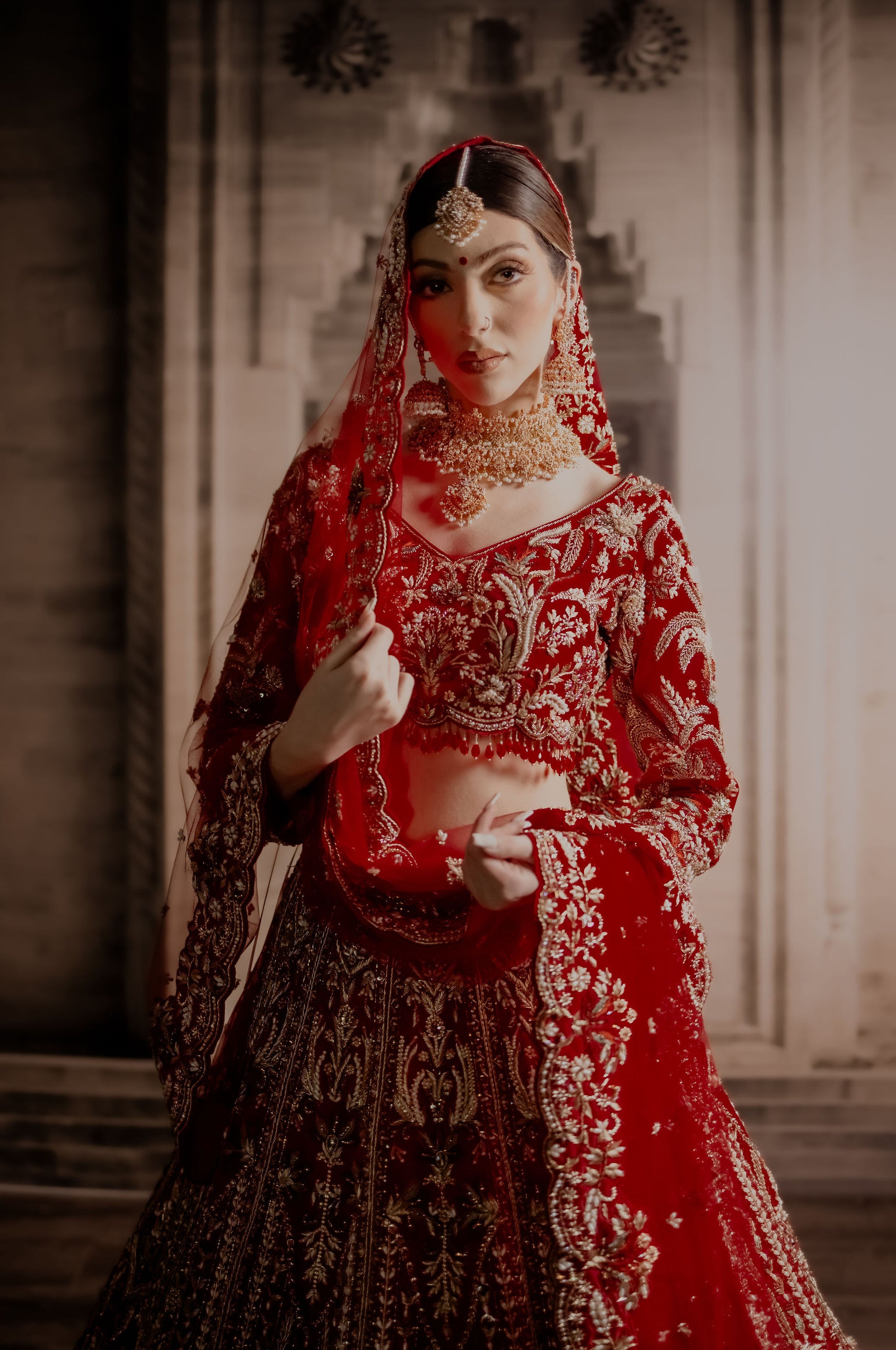 Step into a world of timeless elegance with our captivating Red Bridal Lehenga, meticulously handcrafted to add a touch of ethereal beauty to your special day. Crafted from luxurious red organza fabric, this enchanting ensemble is adorned with intricate floral motifs embellished with exquisite gold embroidery, showcasing a blend of traditional craftsmanship and modern sophistication.