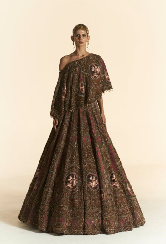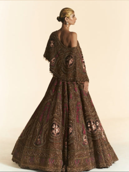 Make a statement with this luxurious off-shoulder cape-style blouse, crafted in a rich chocolate brown base and accented with vibrant magenta and emerald green tones. Featuring intricate zardozi hand embroidery and delicate crystal embellishments, this piece blends traditional craftsmanship with contemporary elegance. Perfectly paired with the matching wedding lehenga, it's an exquisite choice for brides seeking a bold yet sophisticated look.