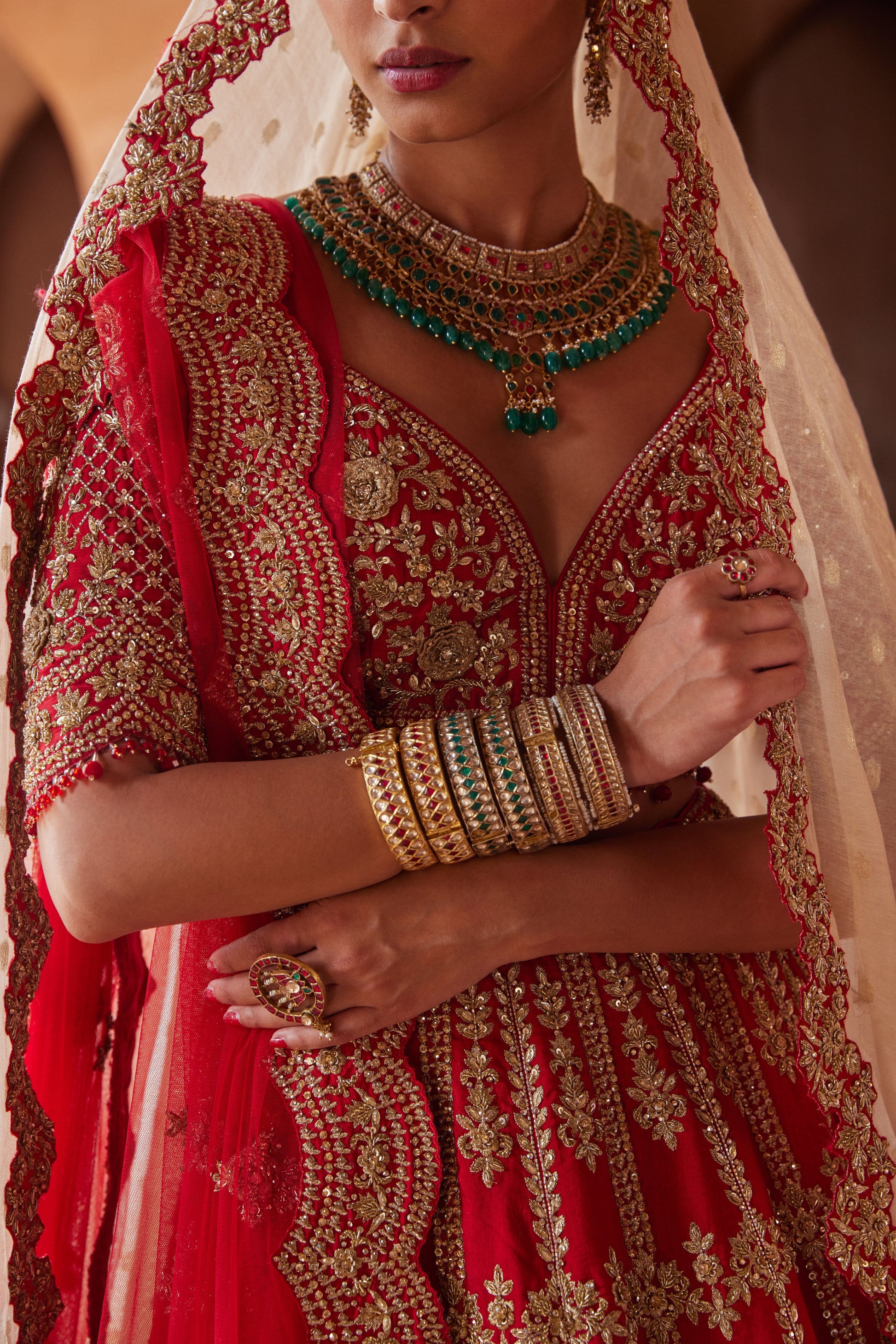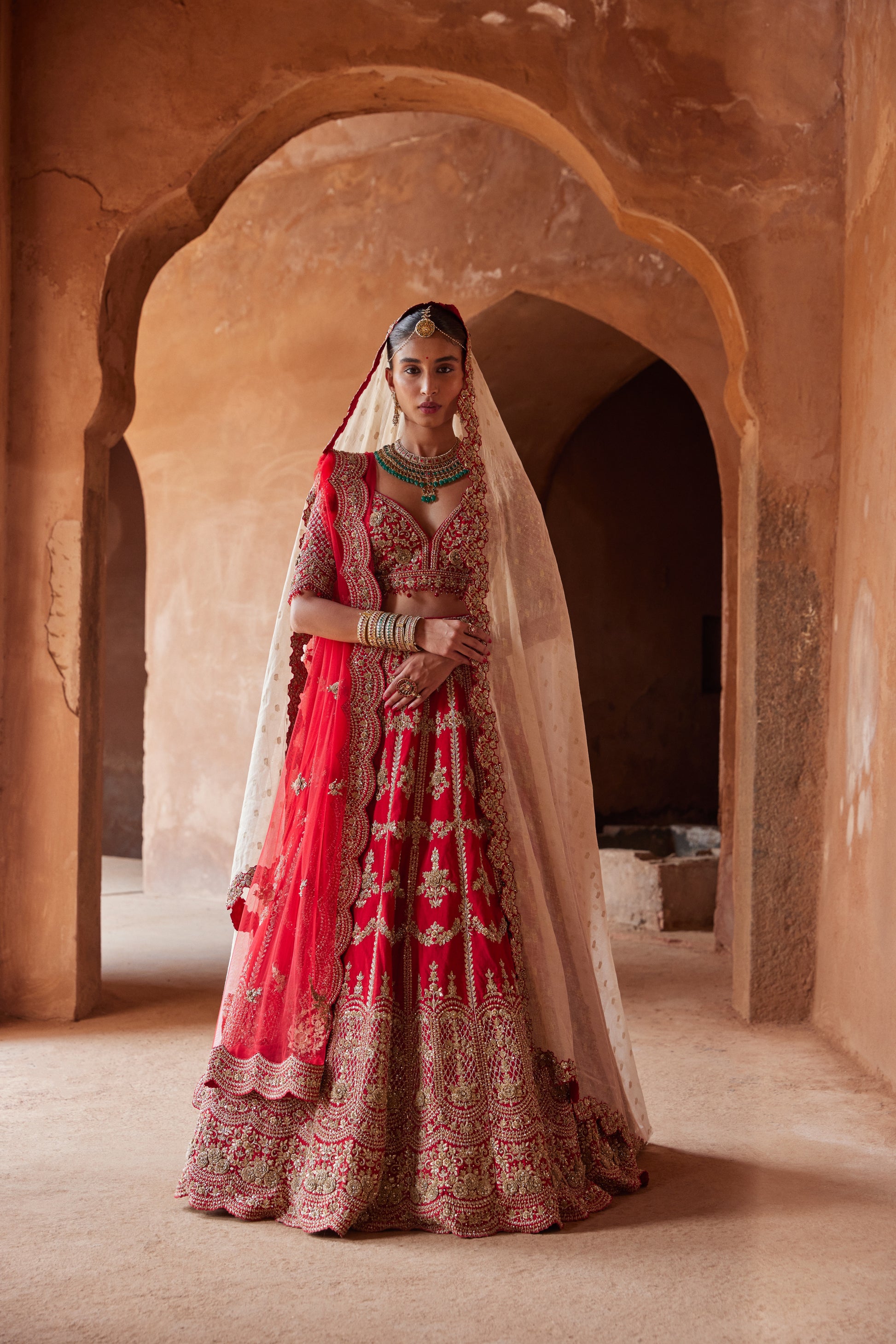 Radiate elegance with this scarlet red raw silk lehenga choli, paired with a scalloped net dupatta adorned with intricate 3D floral embroidery. Featuring delicate gold zari, dabka, sequins, beadwork, and shimmering crystals, this ensemble is a celebration of artistry and opulence. Complete the look with an optional embroidered gold tissue dupatta, adding a regal touch to your bridal attire. A stunning choice for the bride who desires a blend of timeless tradition and contemporary flair.