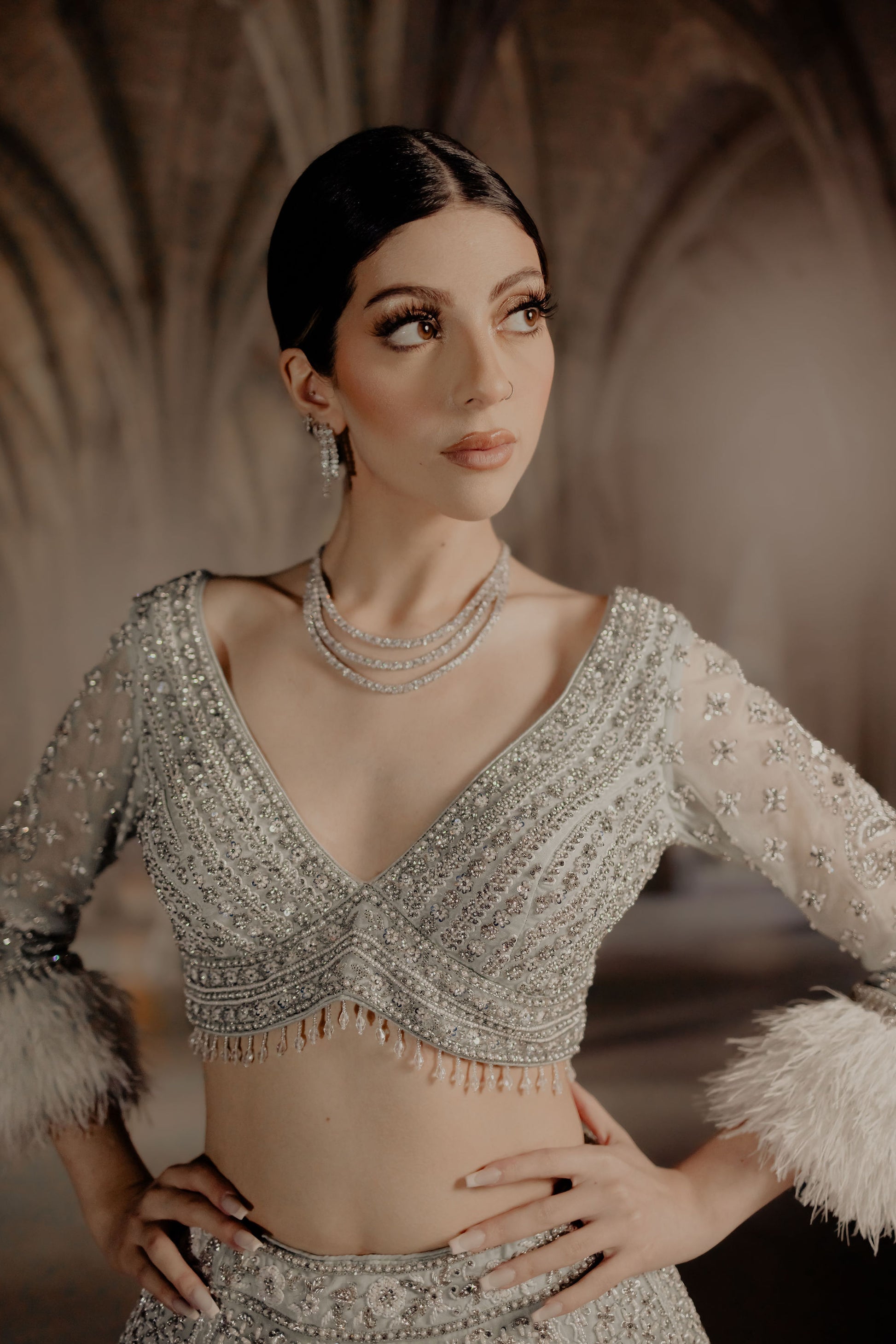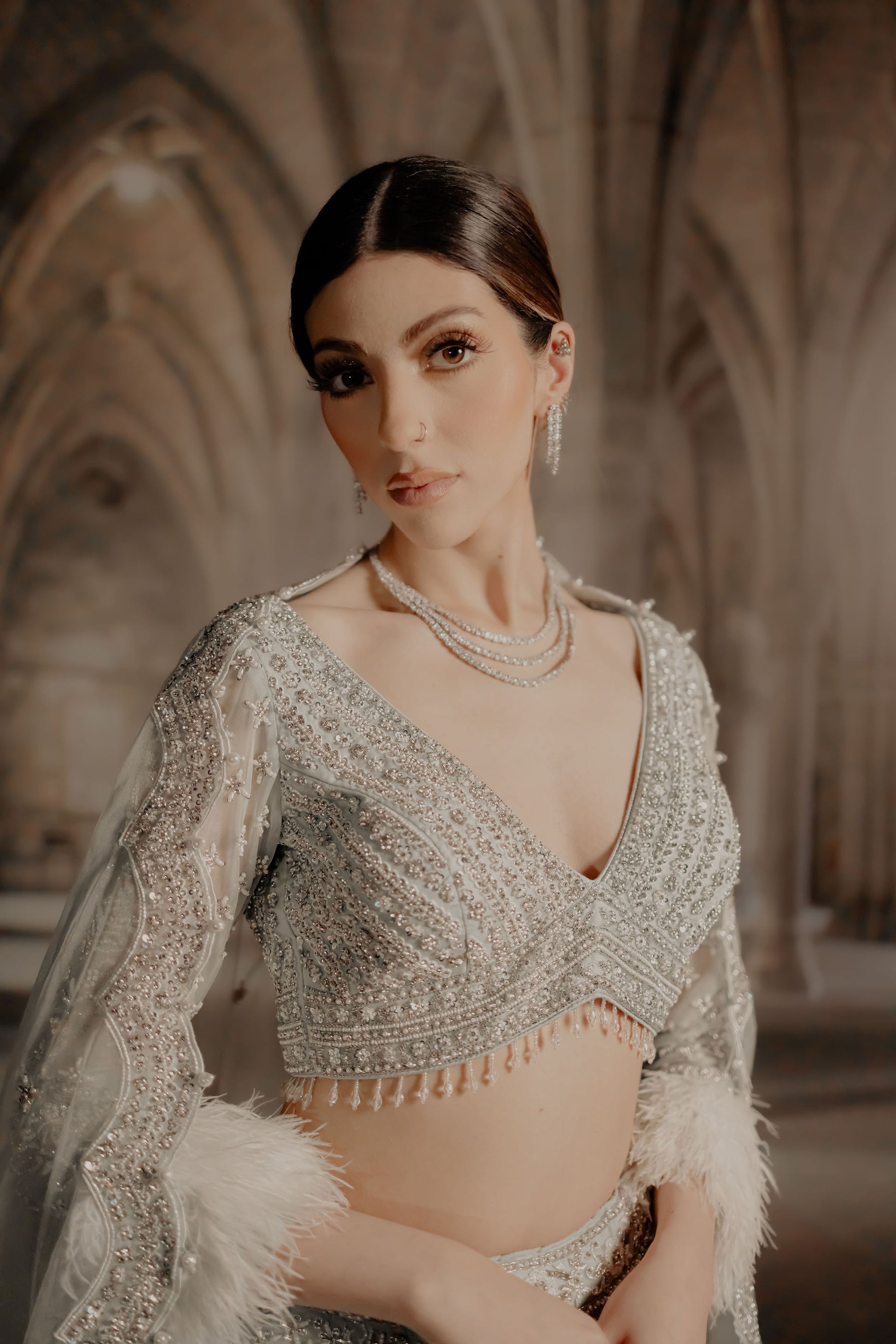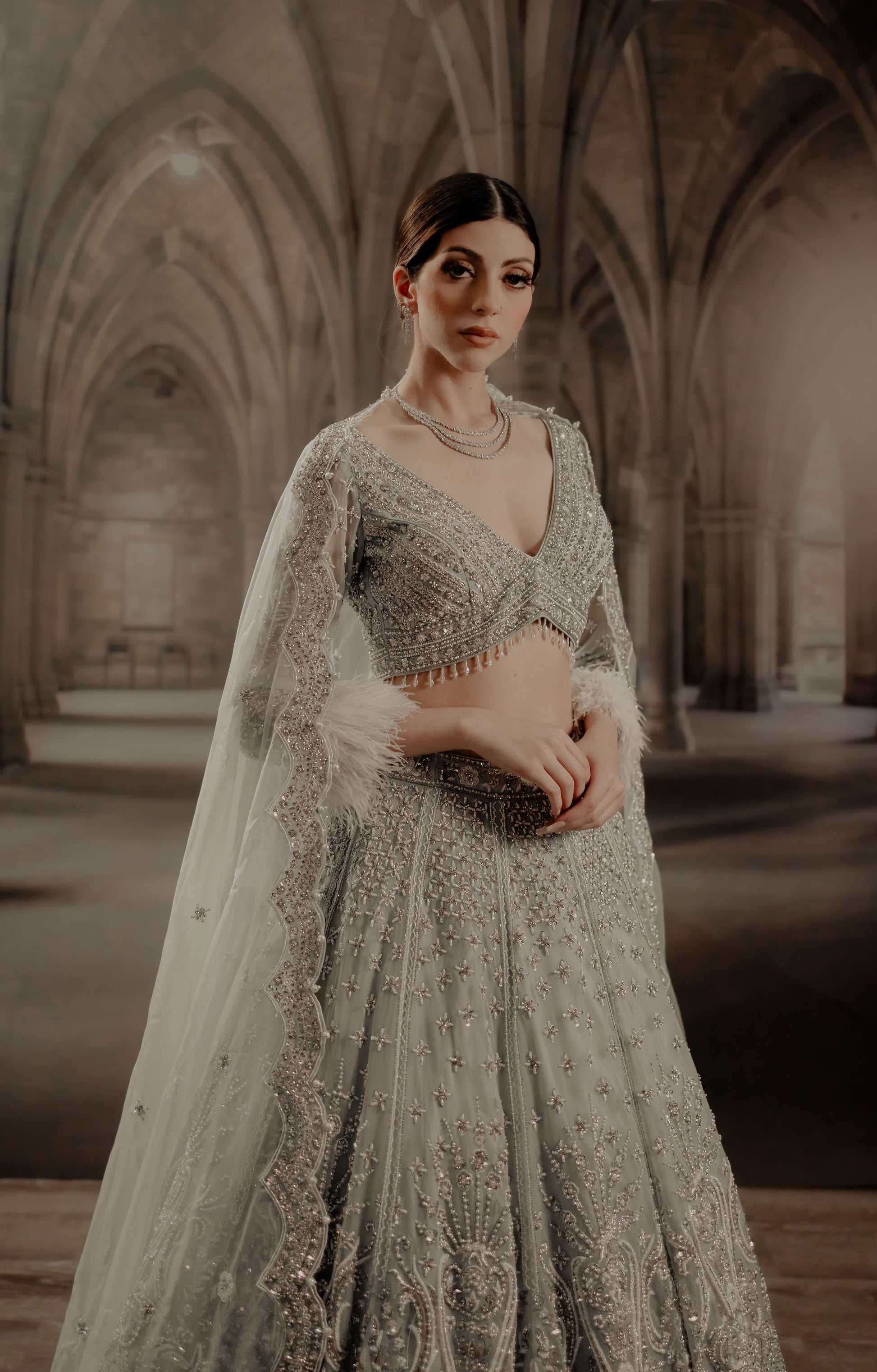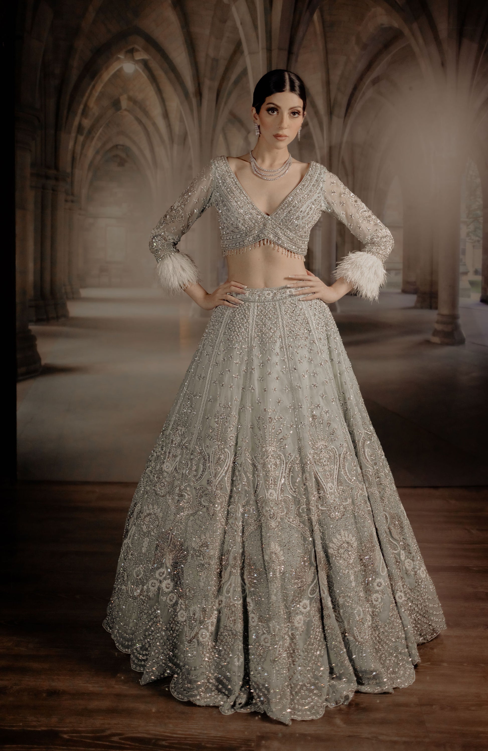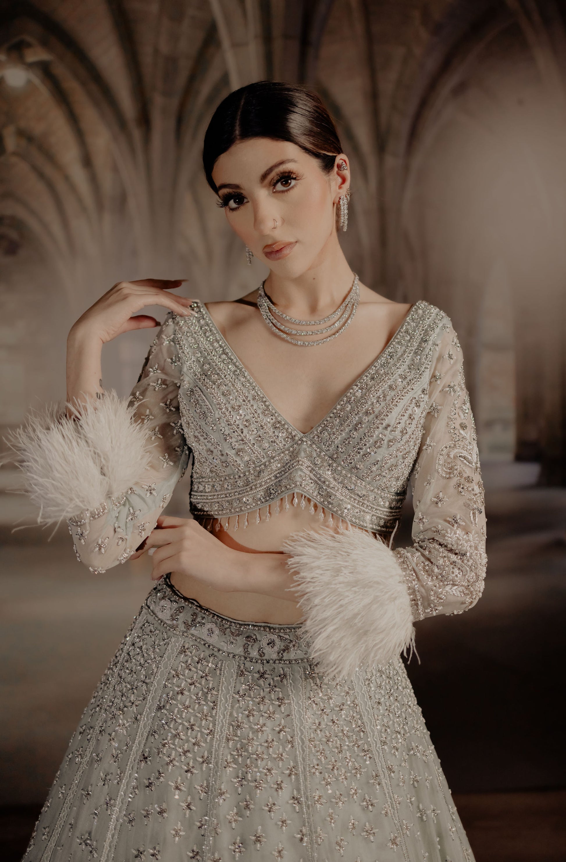 Ethereal Light Mint Green Reception Lehenga, a vision of freshness and sophistication. Crafted from delicate mint green fabric, this enchanting ensemble is adorned with a touch of whimsy with feather detailing on the sleeves, adding a unique and playful element to your bridal attire.