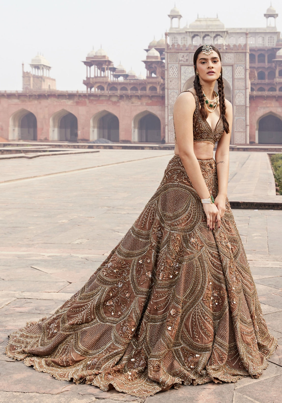 Step into timeless elegance with our Brown Paneled Lehenga. The rich brown hue is beautifully structured with intricate panel detailing, creating a flattering, modern silhouette. Designed with attention to detail and crafted from luxurious fabric, this lehenga blends classic beauty with contemporary style. Ideal for the bride who values understated sophistication, it offers a unique twist on traditional bridal wear. Elevate your wedding day look with a piece that exudes grace, confidence, and a touch of modern charm.
