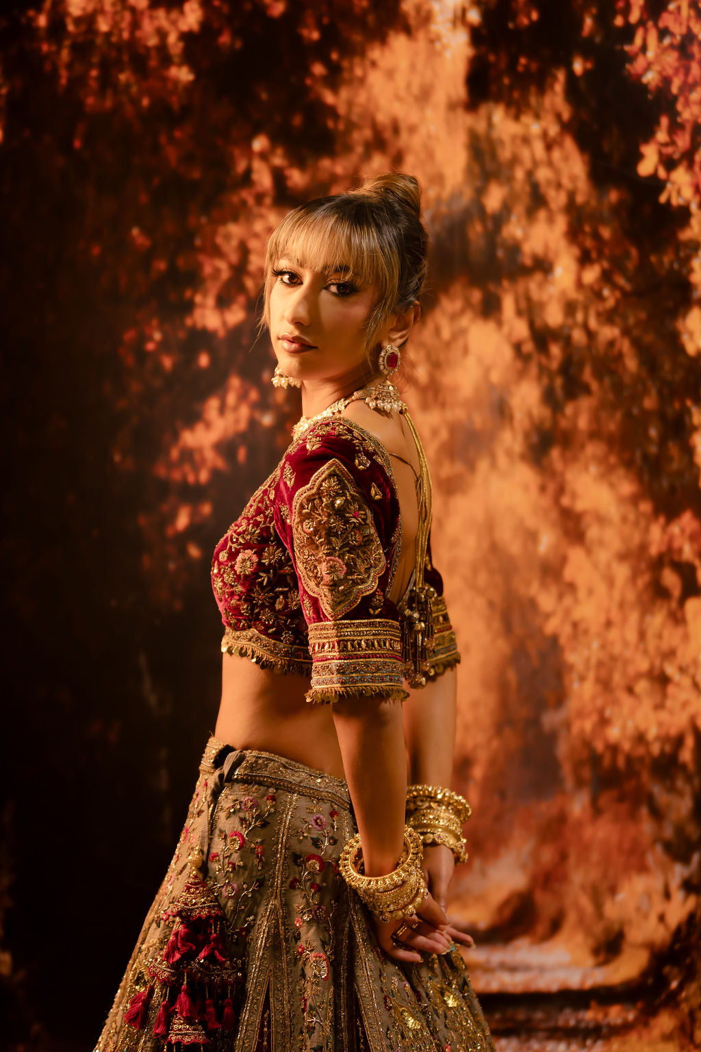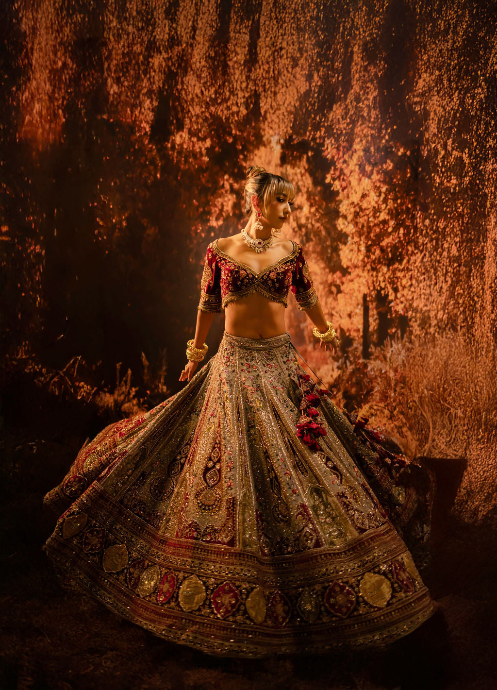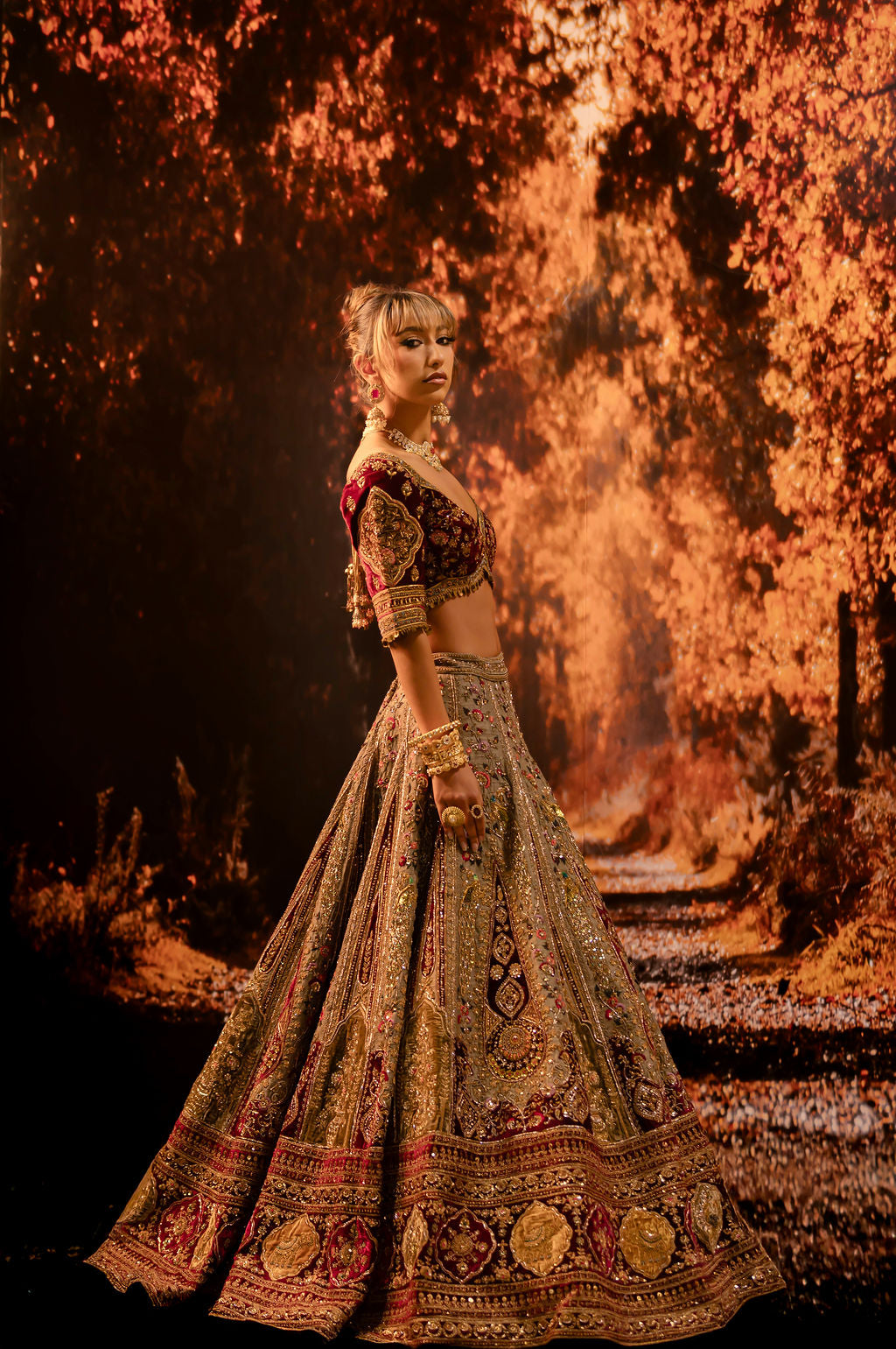 Embrace timeless elegance with our light champagne bridal Lehenga, beautifully adorned with a unique blend of floral and geometric embroidery. Accented with rich maroon highlights, this exquisite ensemble radiates sophistication and charm, perfect for the modern bride seeking a harmonious mix of tradition and style. Crafted from luxurious fabric, it offers comfort and a graceful silhouette. Fully customizable, this Lehenga allows you to personalize every detail, ensuring a flawless fit and a look that reflects your unique bridal vision.