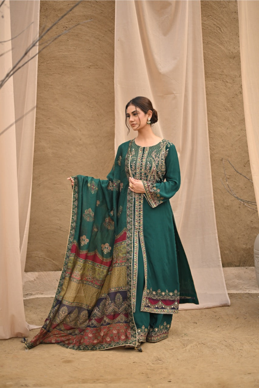 Exquisite bottle green Indian suit designed to capture attention. Made from premium fabric, this stunning ensemble features intricate embroidery that perfectly highlights its rich, vibrant hue. Ideal for festive celebrations or elegant gatherings, this suit seamlessly blends traditional craftsmanship with a modern touch.