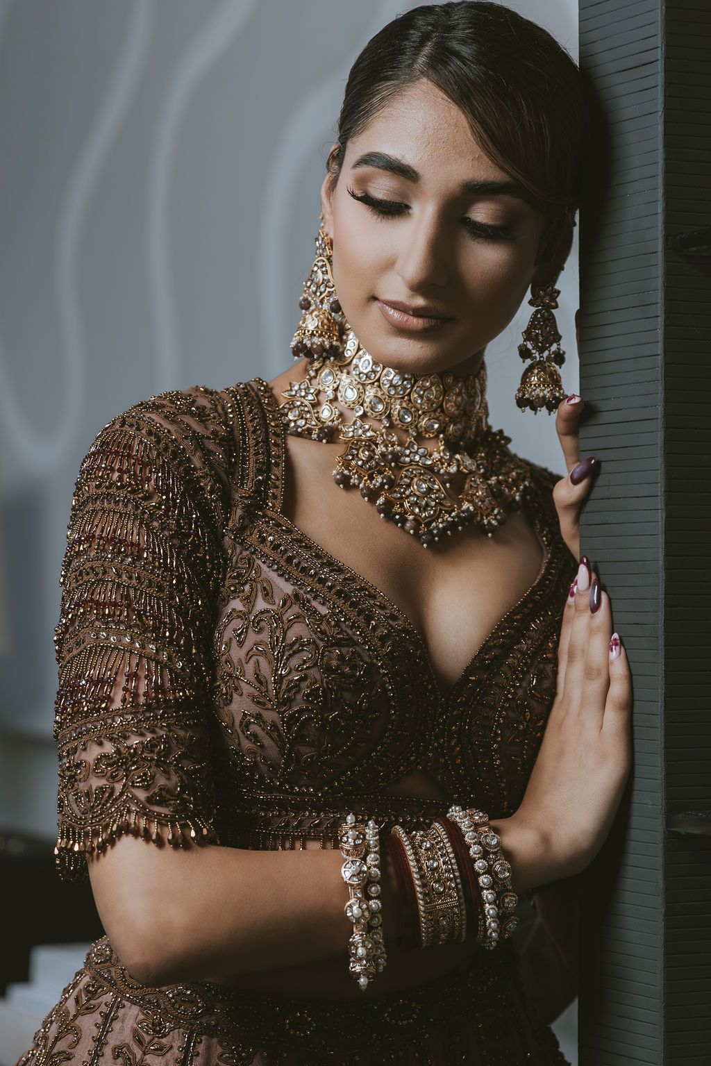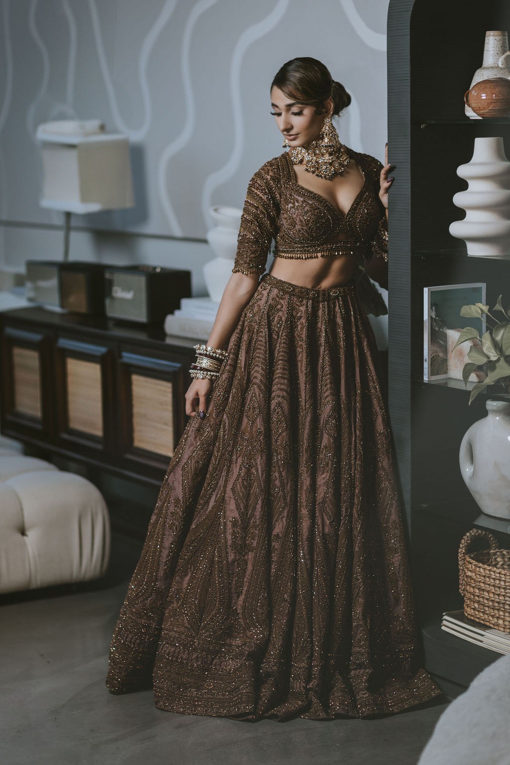 Embrace refined elegance with our mauve-brown silk bridal and reception Lehenga, featuring delicate brown floral embroidery that captures timeless beauty. This luxurious piece is crafted from rich silk fabric, creating a soft, graceful silhouette ideal for the modern bride seeking a unique blend of sophistication and charm. Each Lehenga is fully customizable, allowing you to tailor every detail to your style and ensure a perfect fit for your special day.