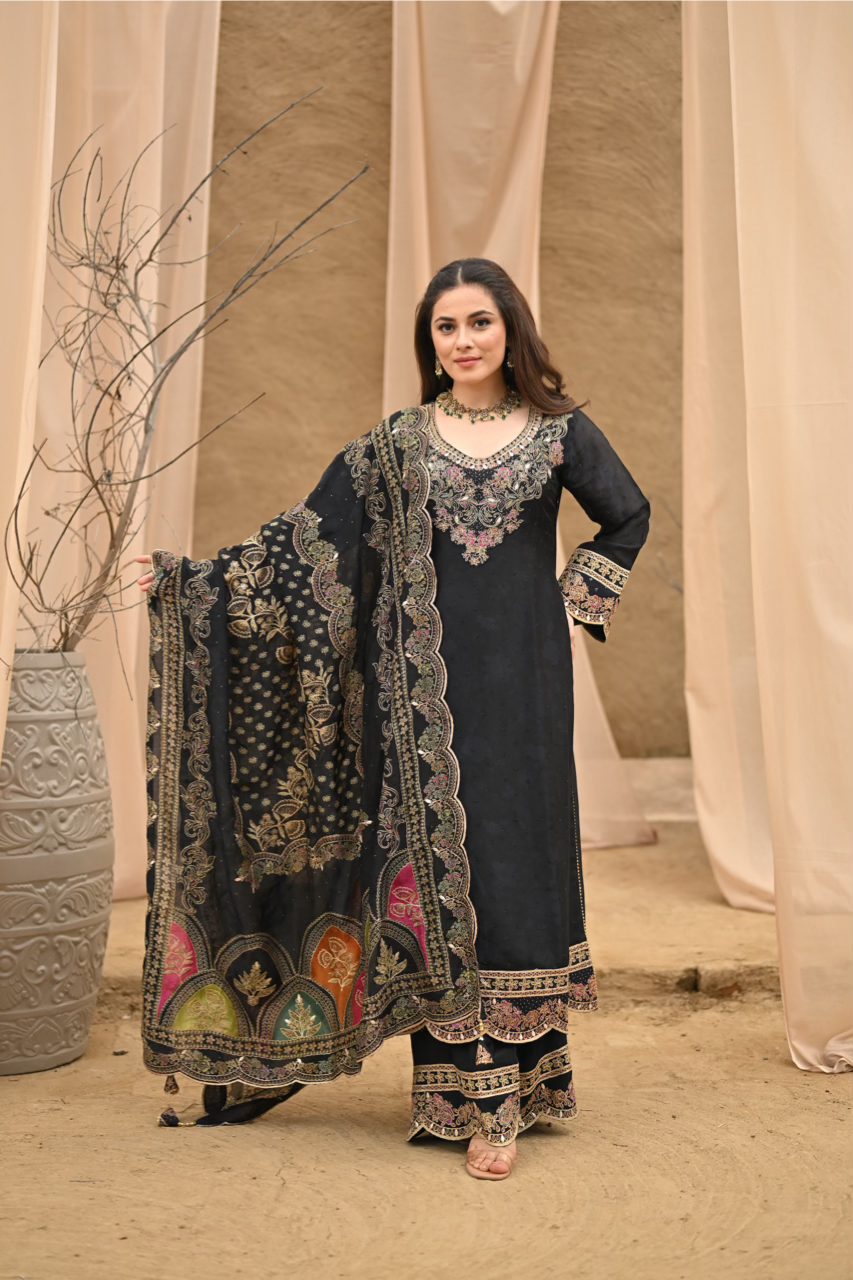 Black suit beautifully adorned with vibrant multicoloured embroidery that celebrates cultural artistry. This exquisite ensemble combines elegance and modern flair, making it perfect for any occasion. The rich black fabric serves as a striking backdrop for the intricate designs, creating a captivating visual experience. Whether you're attending a festive celebration or a chic evening event, this suit ensures you stand out with grace and confidence.