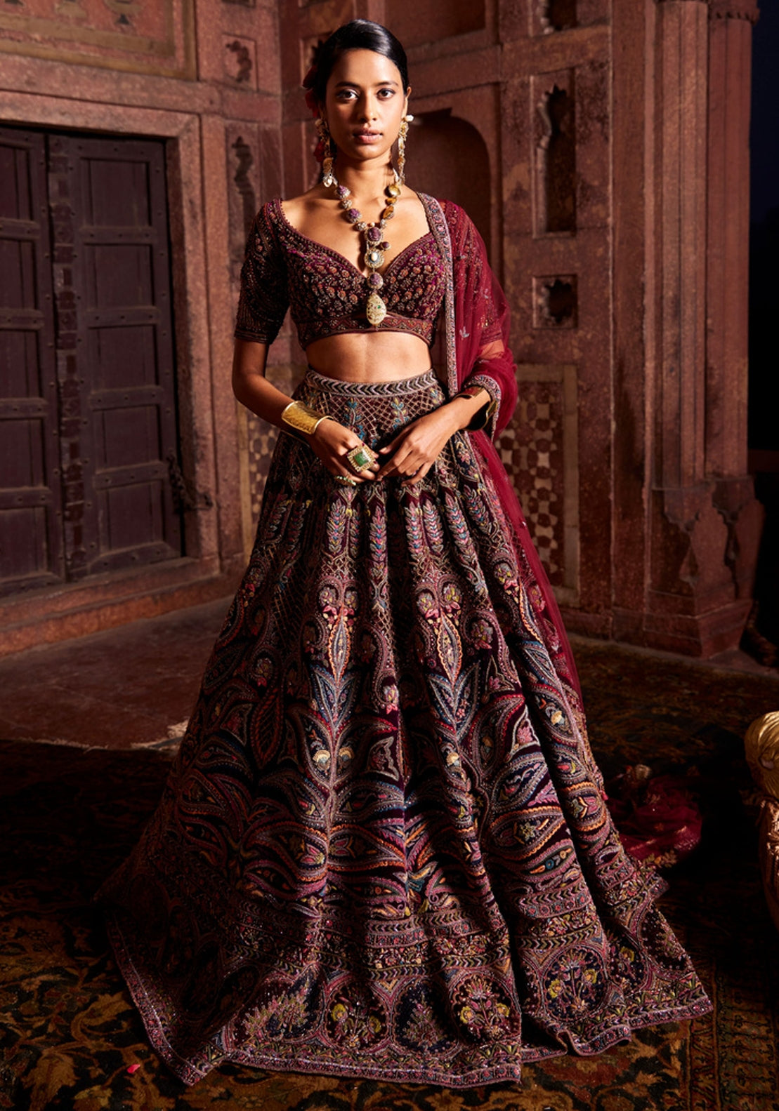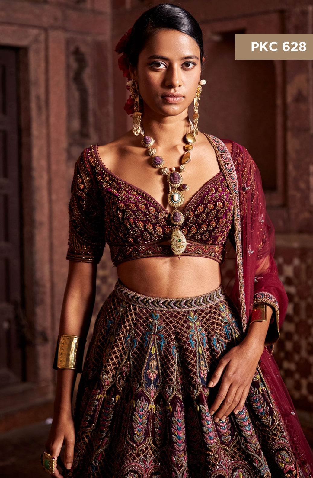 Embrace rich elegance with our Maroon Bridal Lehenga, beautifully accented with vibrant pink and purple hues. The deep maroon base exudes sophistication, while the pink and purple accents add a playful yet regal touch, creating a perfect balance of boldness and grace. Intricate embroidery enhances the lehenga's luxurious fabric, making it an unforgettable choice for the bride who desires a timeless yet unique look. Celebrate your special day in a piece that radiates beauty, confidence, and elegance, designed to leave a lasting impression.