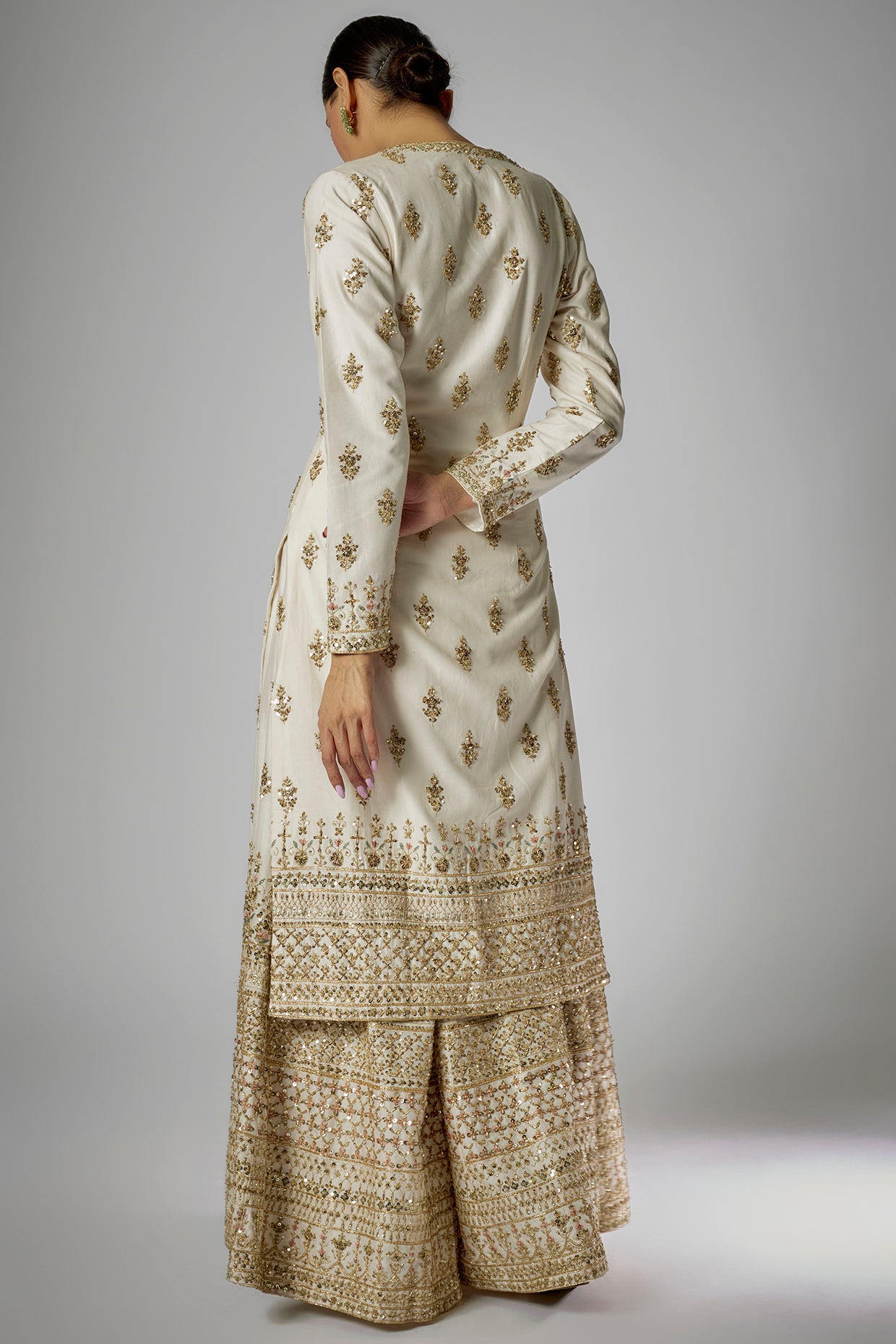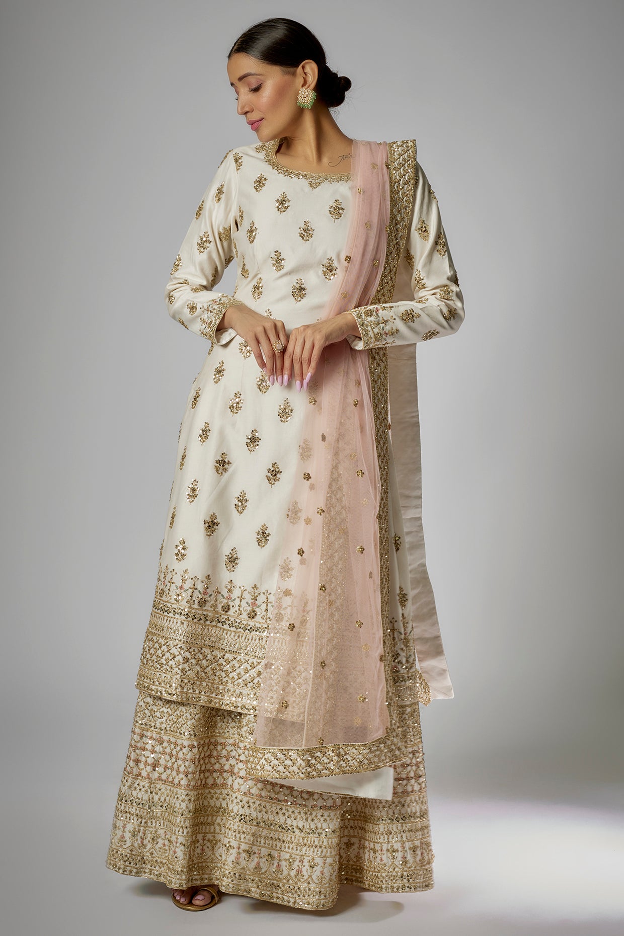 Featuring An Ivory Kurta In Chanderi Base With Sequins Hand And Machine Embroidery. It Is Paired With Matching Flared Sharara Pants And A Contrasting Pink Dupatta.