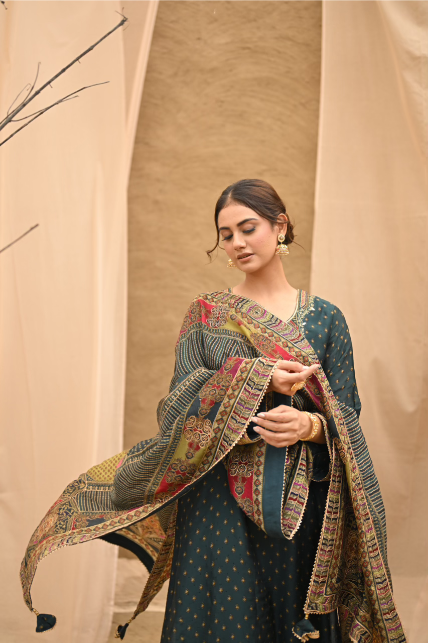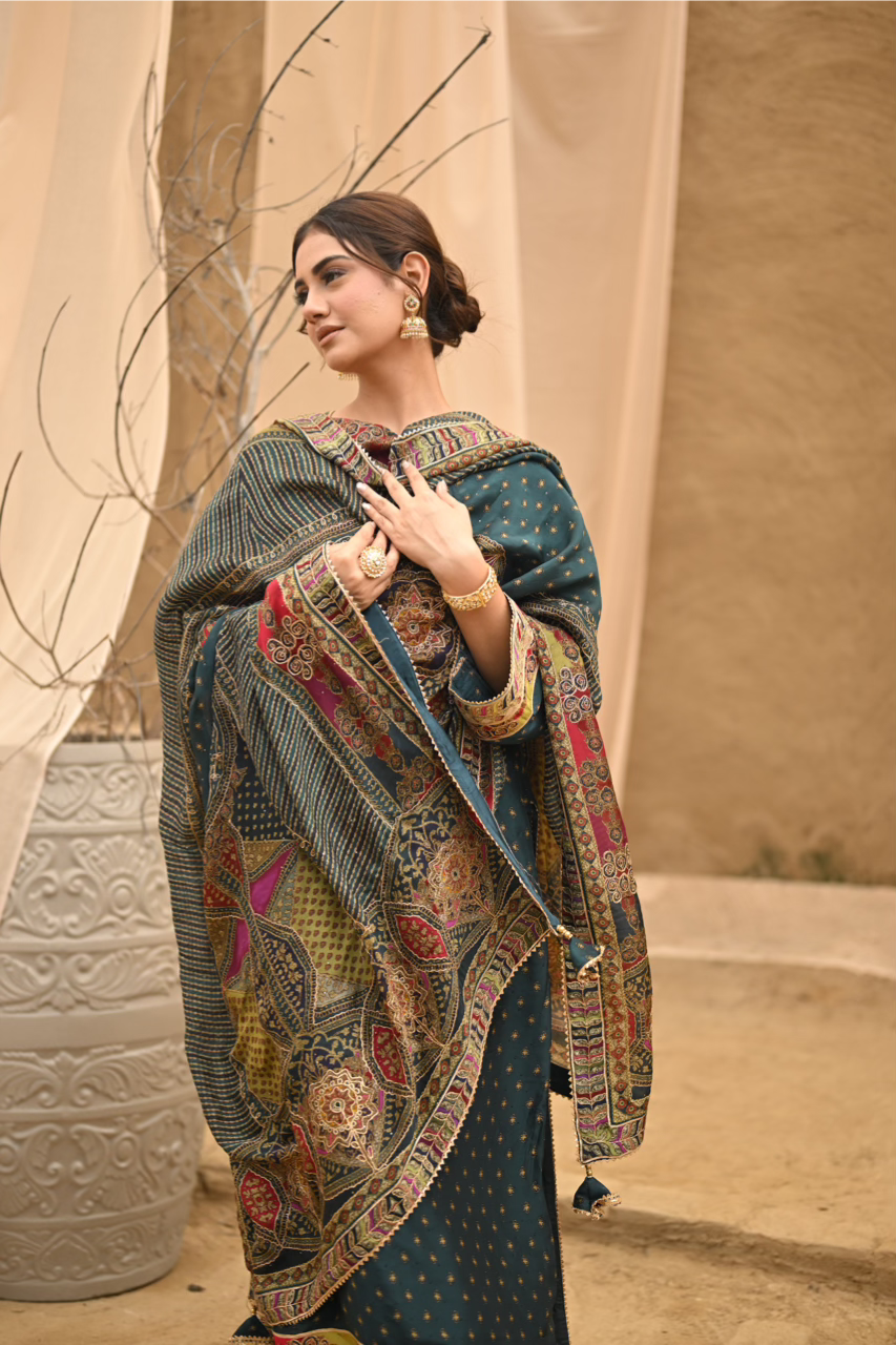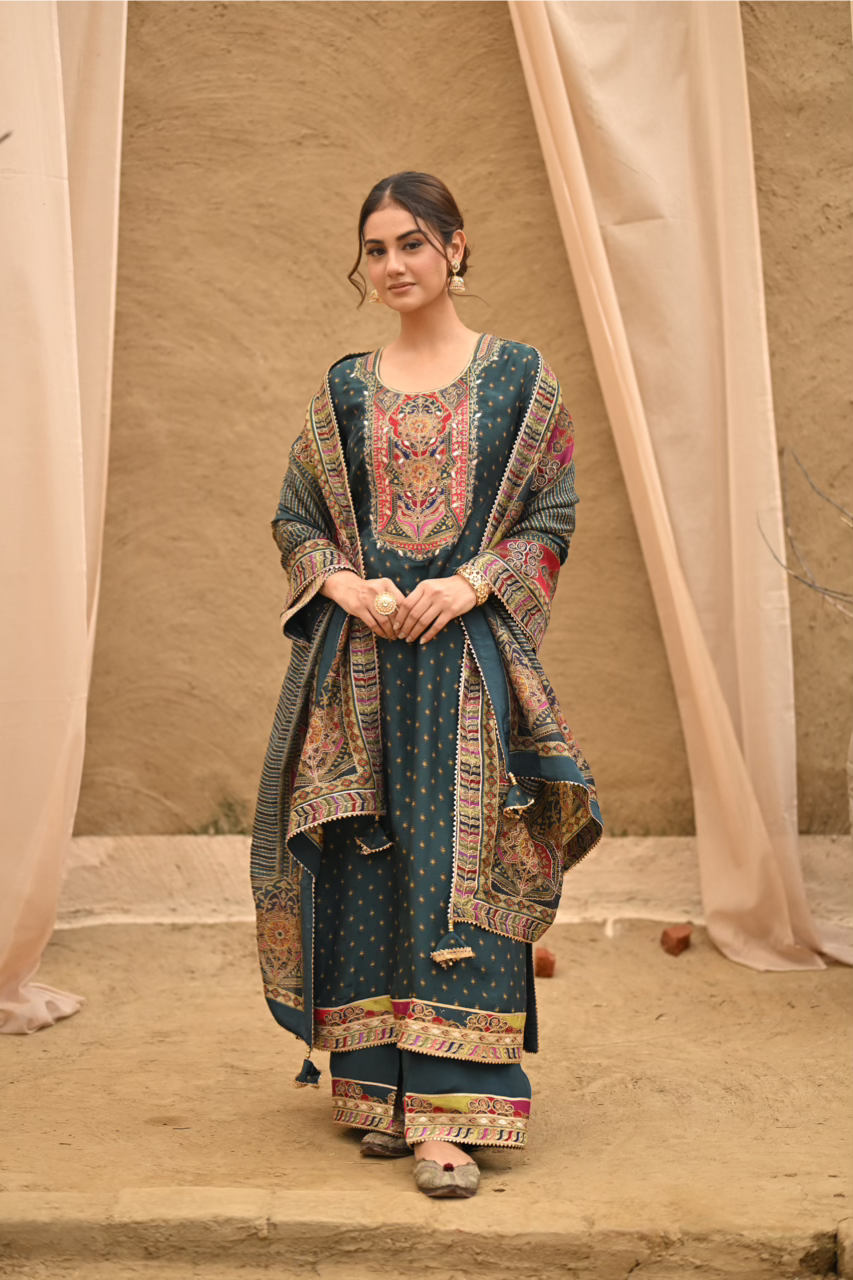 This vibrant Teal ensemble features eye-catching geometric embroidery that adds a contemporary flair to traditional elegance. Crafted from high-quality fabric, it offers both comfort and sophistication, making it perfect for festive occasions or casual gatherings. Embrace the fusion of tradition and trend with this unique piece that effortlessly enhances your wardrobe.