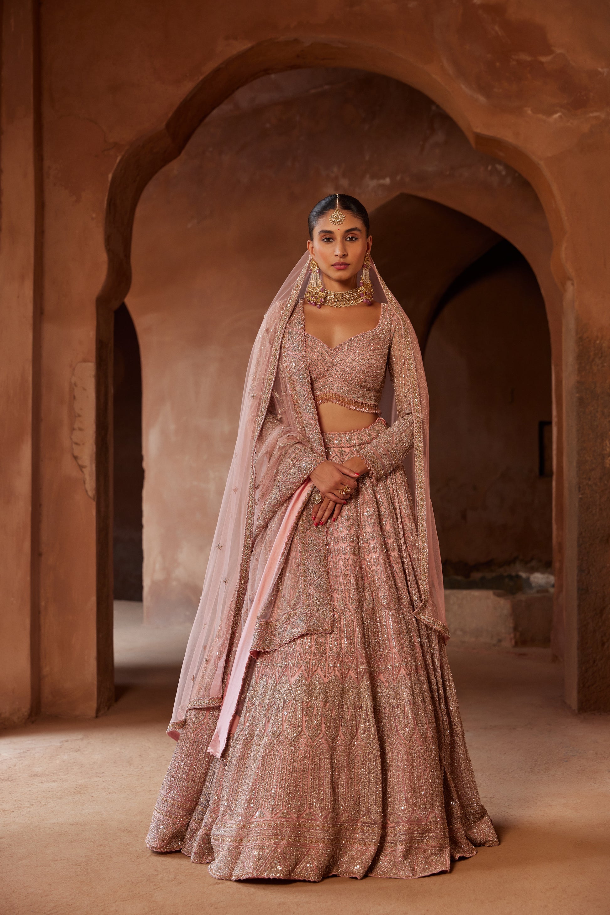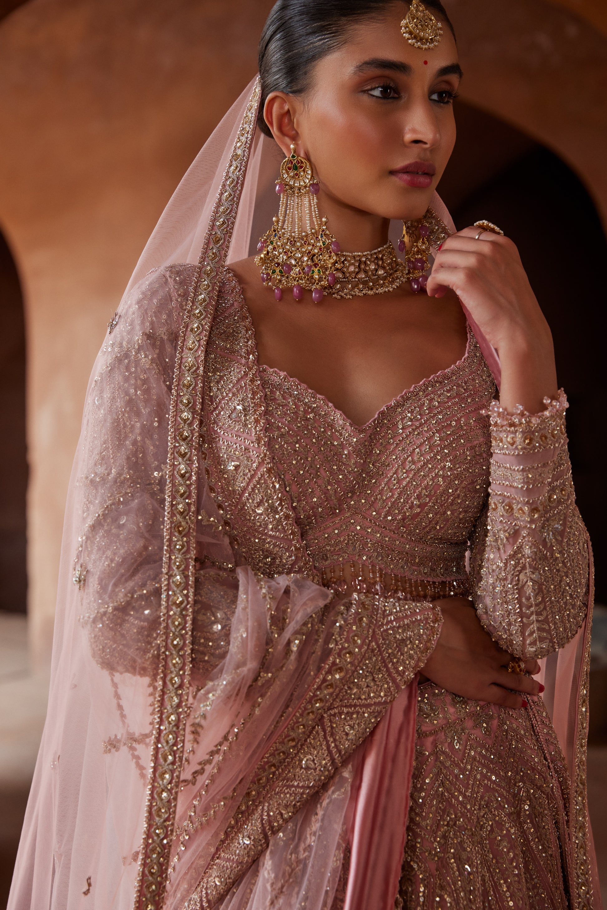 Embrace ethereal beauty with this rose pink net lehenga choli and dupatta, adorned with delicate gold dori embroidery. Overlaid with intricate dabka, shimmering sequins, beads, and dazzling crystals, this ensemble exudes timeless elegance. Enhance the look with an optional second dupatta for added grandeur, making it a perfect choice for the modern bride who seeks sophistication and grace on her special day.