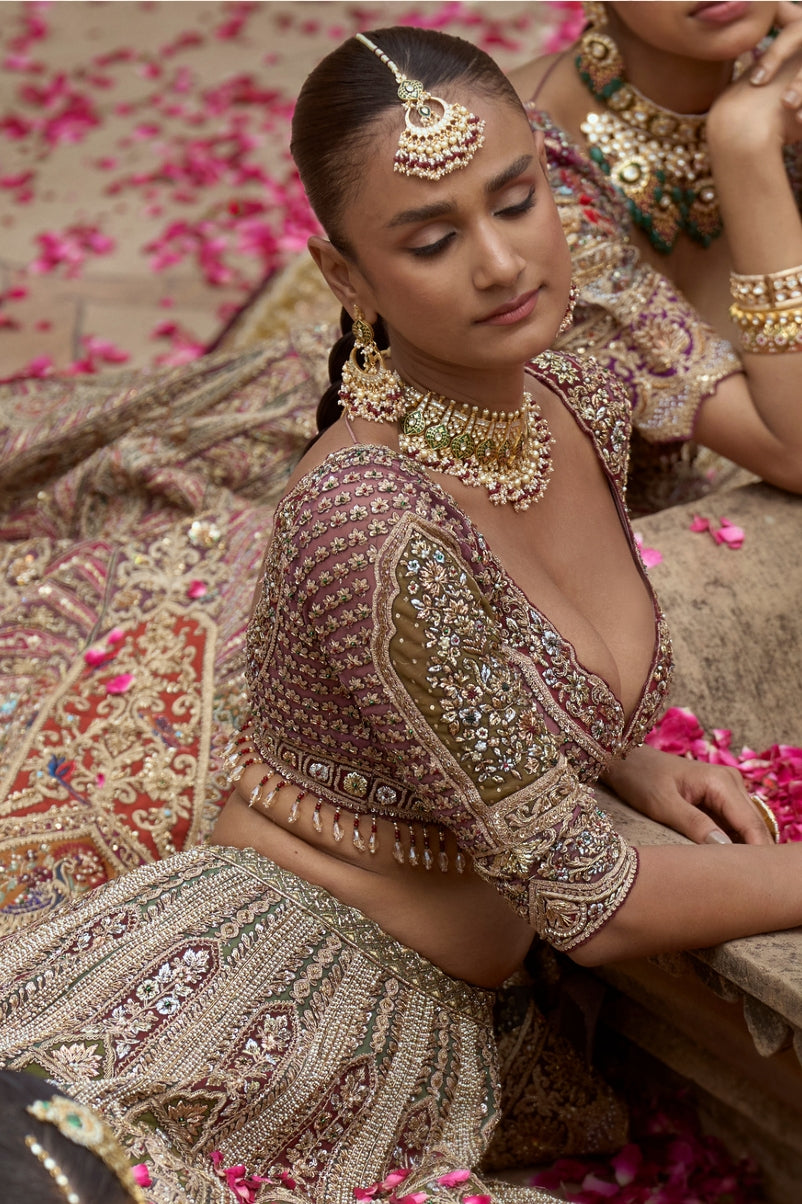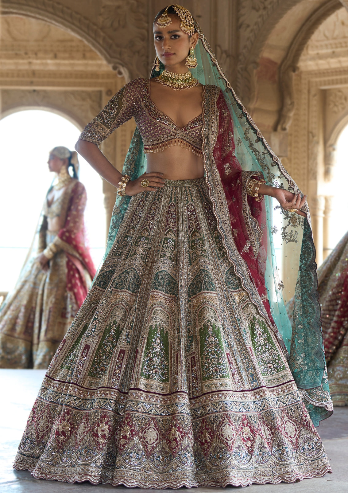 Step into a world of sparkling elegance with our Bedazzled Blue and Green Bridal Lehenga. This stunning piece combines deep blue and lush green tones, adorned with intricate embellishments that catch the light with every movement. The bedazzled design adds a touch of modern glamour while staying rooted in traditional bridal beauty. Crafted for the bride who loves to shine, this lehenga is the perfect choice for a bold and unforgettable wedding look, blending vibrant colors with dazzling craftsmanship for a truly mesmerizing effect.