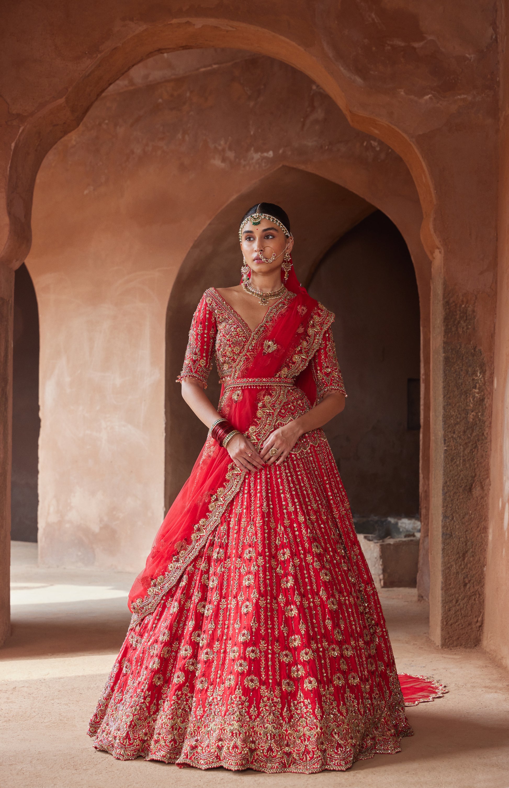 Dazzle in this vermilion red raw silk lehenga choli, enhanced with a refined belt and a net dupatta intricately embroidered with gold zari, dabka, sequins, beads, and crystals. Deeper red resham accents add depth and richness to the design, creating a mesmerizing contrast. Complete your bridal ensemble with the optional embroidered net veil, adding a regal and ethereal touch to your look. Perfect for the bride who cherishes tradition with a hint of modern artistry.