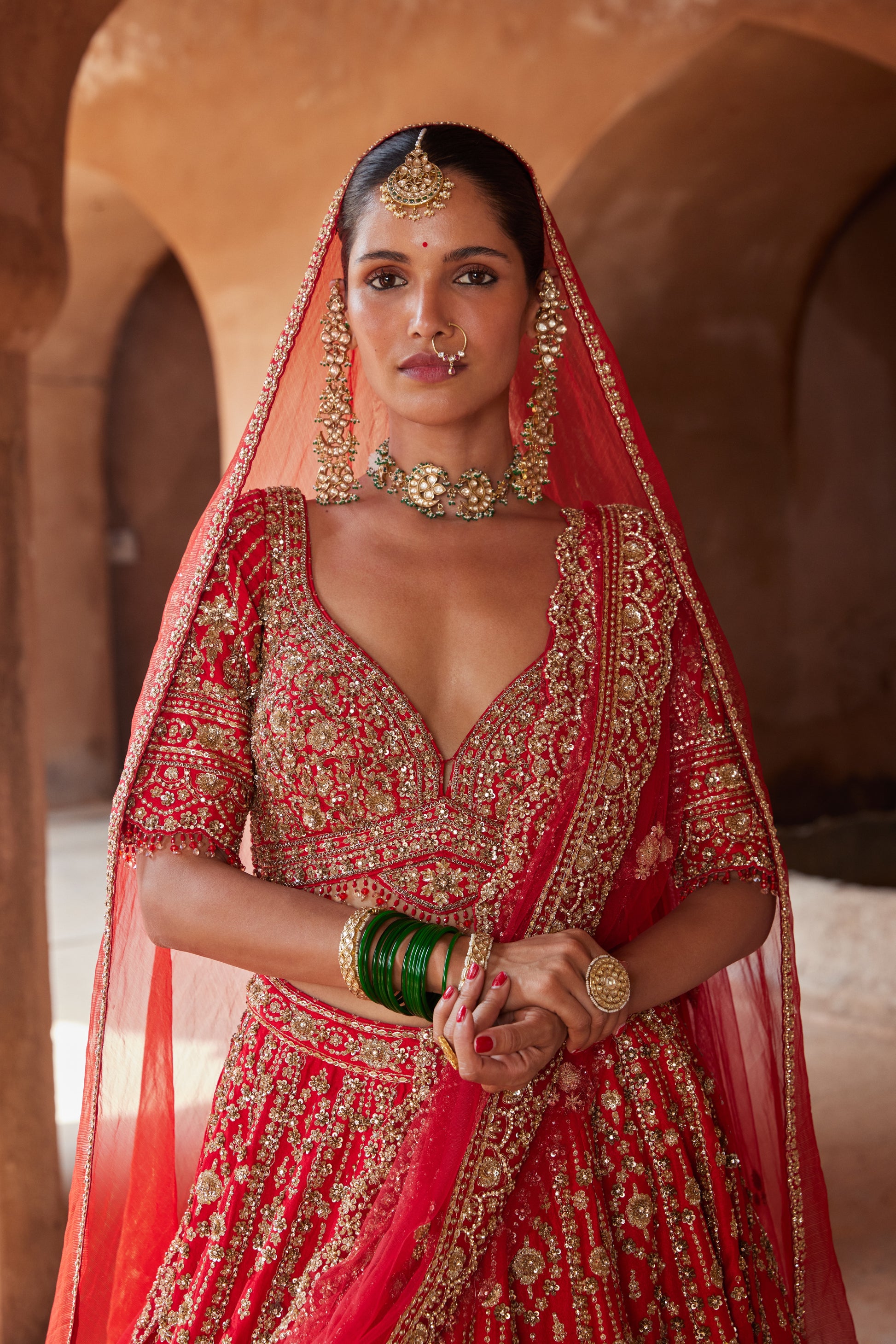 Make a bold statement in this vibrant red raw silk lehenga choli, beautifully paired with a net dupatta. The dupatta features alternating panels of intricate embroidery, adorned with gold dabka, zari, sequins, beadwork, and sparkling crystals, creating a mesmerizing play of textures. For added grandeur, style the ensemble with an optional second net dupatta, perfect for enhancing your regal bridal look. A captivating choice for the bride who seeks timeless beauty with a touch of opulence.