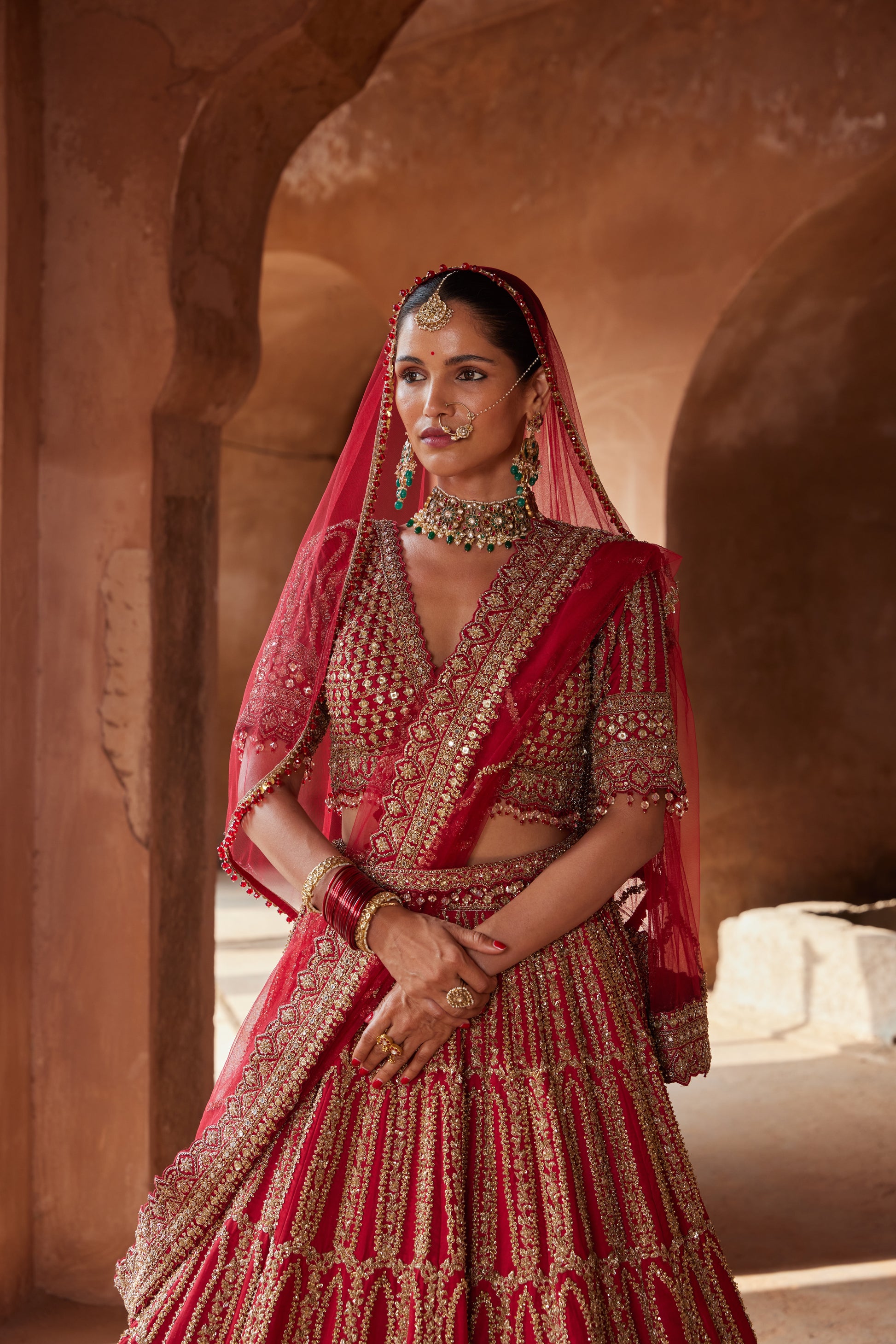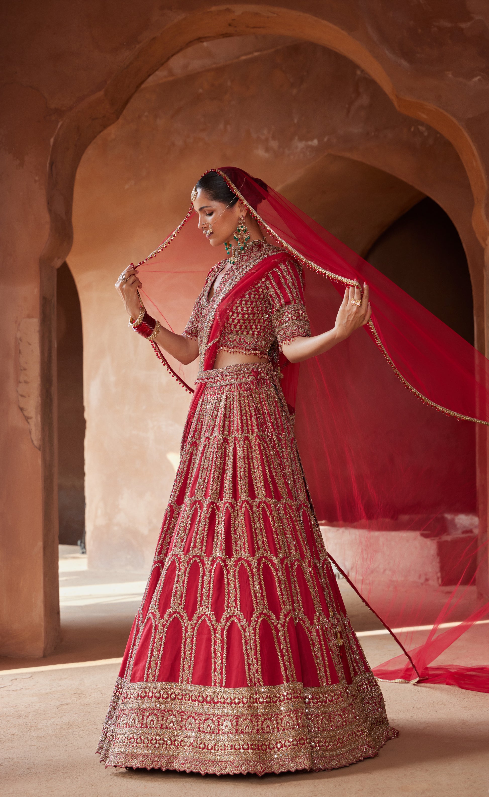 Turn heads in this blood-red raw silk lehenga choli, enhanced with a matching belt and a net dupatta. Featuring delicate zardozi embroidery in a timeless trellis pattern, this ensemble exudes sophistication and classic charm. Complete your bridal look with an optional embroidered net veil, adding an ethereal layer of elegance. Perfect for the bride who seeks understated luxury with a touch of tradition.